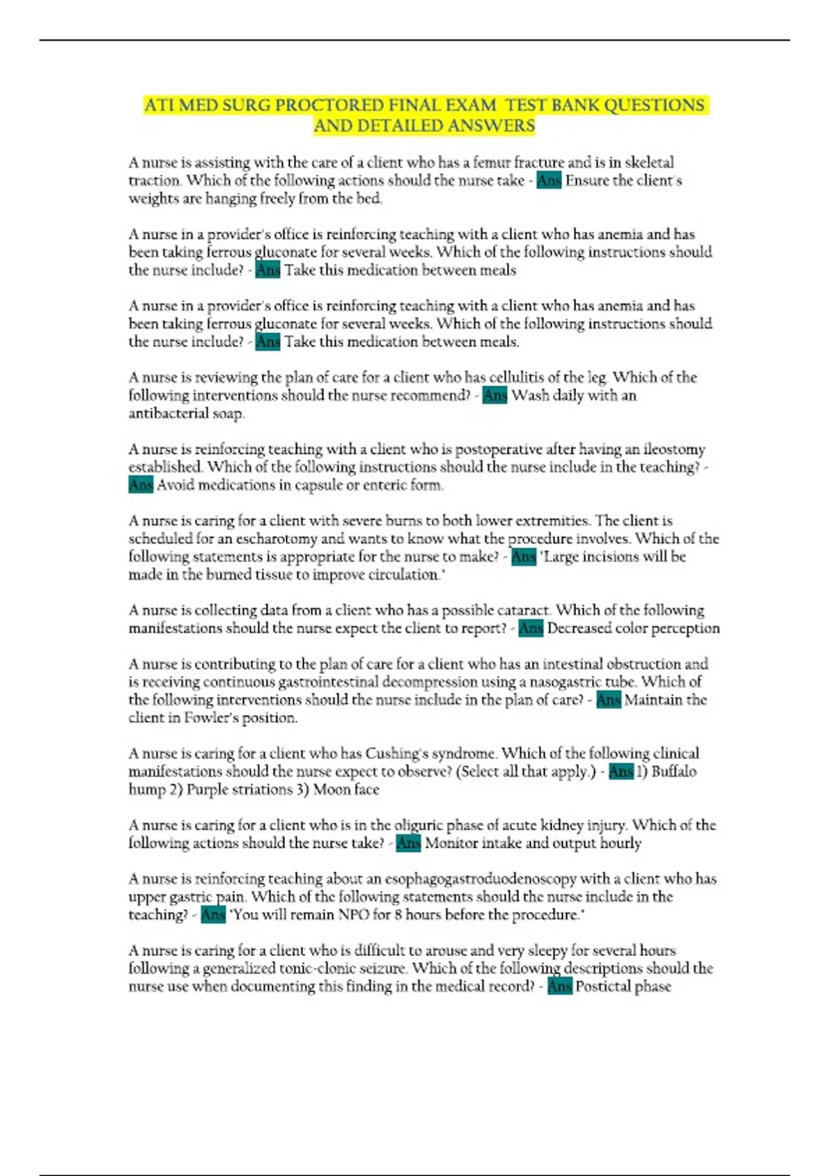 ATI MED SURG PROCTORED FINAL EXAM TEST BANK QUESTIONS AND DETAILED ANSWERS A nurse is assisting with the care of a client who has a femur fracture and is in skeletal traction. Which of the following actions should the nurse take - Ans Ensure the client's weights are hanging freely from the bed. A nurse in a provider's office is reinforcing teaching with a client who has anemia and has been taking ferrous gluconate for several weeks. Which of the following instructions should the nurse include? - Ans Take this medication between meals A nurse in a provider's office is reinforcing teaching with a client who has anemia and has been taking ferrous gluconate for several weeks. Which of the following instructions should the nurse include? - Ans Take this medication between meals. A nurse is reviewing the plan of care for a client who has cellulitis of the leg. Which of the following interventions should the nurse recommend? - Ans Wash daily with an antibacterial soap. A nurse is reinforcing teaching with a client who is postoperative after having an ileostomy established. Which of the following instructions should the nurse include in the teaching? - Ans Avoid medications in capsule or enteric form. A nurse is caring for a client with severe burns to both lower extremities. The client is scheduled for an escharotomy and wants to know what the procedure involves. Which of the following statements is appropriate for the nurse to make? - Ans "Large incisions will be made in the burned tissue to improve circulation." A nurse is collecting data from a client who has a possible cataract. Which of the following manifestations should the nurse expect the client to report? - Ans Decreased color perception A nurse is contributing to the plan of care for a client who has an intestinal obstruction and is receiving continuous gastrointestinal decompression using a nasogastric tube. Which of the following interventions should the nurse include in the plan of care? - Ans Maintain the client in Fowler's position. A nurse is caring for a client who has Cushing's syndrome. Which of the following clinical manifestations should the nurse expect to observe? (Select all that apply.) - Ans 1) Buffalo hump 2) Purple striations 3) Moon face A nurse is caring for a client who is in the oliguric phase of acute kidney injury. Which of the following actions should the nurse take? - Ans Monitor intake and output hourly A nurse is reinforcing teaching about an esophagogastroduodenoscopy with a client who has upper gastric pain. Which of the following statements should the nurse include in the teaching? - Ans "You will remain NPO for 8 hours before the procedure." A nurse is caring for a client who is difficult to arouse and very sleepy for several hours following a generalized tonic-clonic seizure. Which of the following descriptions should the nurse use when documenting this finding in the medical record? - Ans Postictal phase