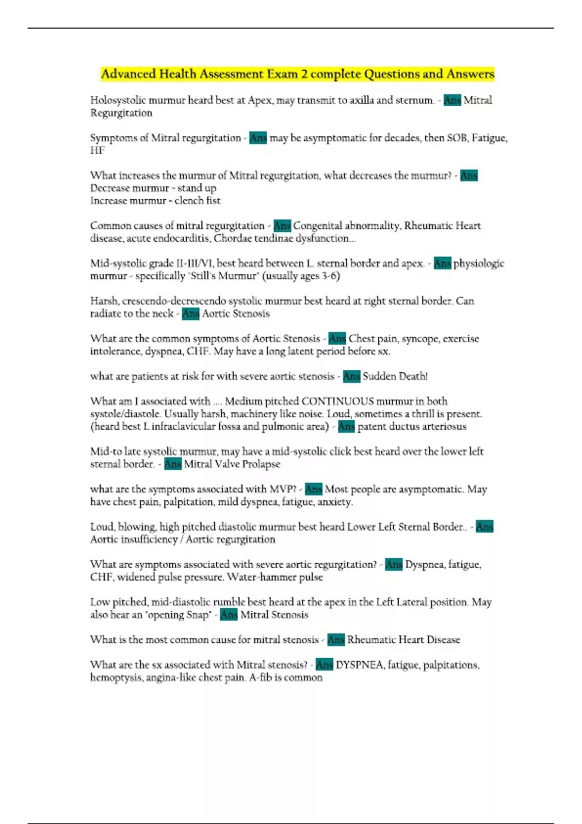 Advanced Health Assessment Exam 2 complete Questions and Answers Holosystolic murmur heard best at Apex, may transmit to axilla and sternum. - Ans Mitral Regurgitation Symptoms of Mitral regurgitation - Ans may be asymptomatic for decades, then SOB, Fatigue, HF What increases the murmur of Mitral regurgitation, what decreases the murmur? - Ans Decrease murmur = stand up Increase murmur = clench fist Common causes of mitral regurgitation - Ans Congenital abnormality, Rheumatic Heart disease, acute endocarditis, Chordae tendinae dysfunction... Mid-systolic grade II-III/VI, best heard between L. sternal border and apex. - Ans physiologic murmur - specifically "Still's Murmur" (usually ages 3-6) Harsh, crescendo-decrescendo systolic murmur best heard at right sternal border. Can radiate to the neck - Ans Aortic Stenosis What are the common symptoms of Aortic Stenosis - Ans Chest pain, syncope, exercise intolerance, dyspnea, CHF. May have a long latent period before sx. what are patients at risk for with severe aortic stenosis - Ans Sudden Death! What am I associated with .... Medium pitched CONTINUOUS murmur in both systole/diastole. Usually harsh, machinery like noise. Loud, sometimes a thrill is present. (heard best L infraclavicular fossa and pulmonic area) - Ans patent ductus arteriosus Mid-to late systolic murmur, may have a mid-systolic click best heard over the lower left sternal border. - Ans Mitral Valve Prolapse what are the symptoms associated with MVP? - Ans Most people are asymptomatic. May have chest pain, palpitation, mild dyspnea, fatigue, anxiety. Loud, blowing, high pitched diastolic murmur best heard Lower Left Sternal Border.. - Ans Aortic insufficiency / Aortic regurgitation What are symptoms associated with severe aortic regurgitation? - Ans Dyspnea, fatigue, CHF, widened pulse pressure. Water-hammer pulse Low pitched, mid-diastolic rumble best heard at the apex in the Left Lateral position. May also hear an "opening Snap" - Ans Mitral Stenosis What is the most common cause for mitral stenosis - Ans Rheumatic Heart Disease What are the sx associated with Mitral stenosis? - Ans DYSPNEA, fatigue, palpitations, hemoptysis, angina-like chest pain. A-fib is common