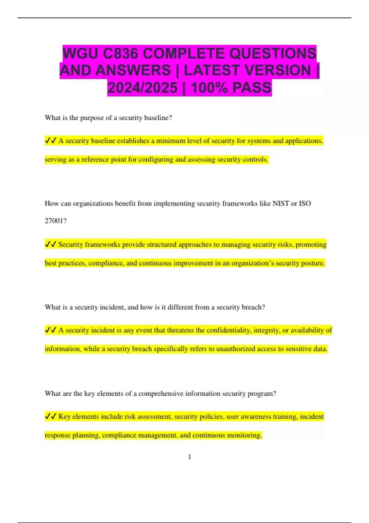 WGU C836 COMPLETE QUESTIONS AND ANSWERS | LATEST VERSION | 2024/2025 | 100% PASS What is the purpose of a security baseline? A security baseline establishes a minimum level of security for systems and applications, serving as a reference point for configuring and assessing security controls. How can organizations benefit from implementing security frameworks like NIST or ISO 27001? Security frameworks provide structured approaches to managing security risks, promoting best practices, compliance, and continuous improvement in an organization’s security posture. What is a security incident, and how is it different from a security breach? A security incident is any event that threatens the confidentiality, integrity, or availability of information, while a security breach specifically refers to unauthorized access to sensitive data. What are the key elements of a comprehensive information security program? Key elements include risk assessment, security policies, user awareness training, incident response planning, compliance management, and continuous monitoring. 2 What is the purpose of conducting a business impact analysis (BIA)? A business impact analysis assesses the potential effects of disruptions to critical business functions, helping organizations prioritize recovery efforts and allocate resources effectively. What is the difference between a risk assessment and a vulnerability assessment? A risk assessment evaluates the likelihood and impact of potential threats to assets, while a vulnerability assessment identifies weaknesses in systems that could be exploited. How does encryption protect data at rest and in transit? Encryption transforms data into an unreadable format, ensuring that unauthorized users cannot access or interpret the information, whether stored (at rest) or being transmitted (in transit). What is the role of an information security policy? An information security policy defines the rules and procedures for protecting an organization’s information assets, establishing accountability and guiding employee behavior. What are the common types of access control models? 3 Common access control models include discretionary access control (DAC), mandatory access control (MAC), and role-based access control (RBAC). What is an adversary in the context of information security? An adversary is an individual or group that seeks to exploit vulnerabilities to compromise the security of an information system or data. How does multifactor authentication (MFA) enhance security? Multifactor authentication requires users to provide multiple forms of verification, such as passwords and biometric data, making unauthorized access significantly more difficult. What is the significance of conducting penetration