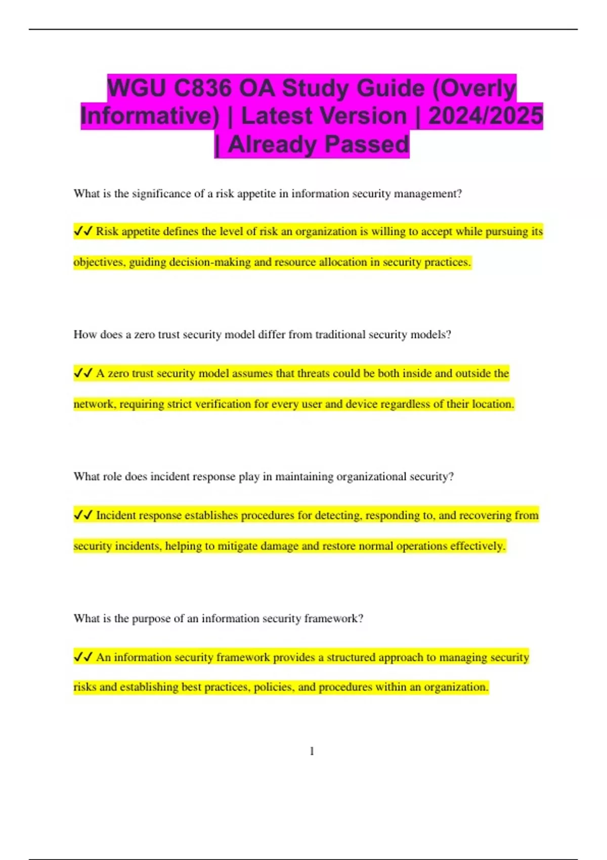 WGU C836 OA Study Guide (Overly Informative) | Latest Version | 2024/2025 | Already Passed What is the significance of a risk appetite in information security management? Risk appetite defines the level of risk an organization is willing to accept while pursuing its objectives, guiding decision-making and resource allocation in security practices. How does a zero trust security model differ from traditional security models? A zero trust security model assumes that threats could be both inside and outside the network, requiring strict verification for every user and device regardless of their location. What role does incident response play in maintaining organizational security? Incident response establishes procedures for detecting, responding to, and recovering from security incidents, helping to mitigate damage and restore normal operations effectively. What is the purpose of an information security framework? An information security framework provides a structured approach to managing security risks and establishing best practices, policies, and procedures within an organization. 2 What is data classification, and why is it important? Data classification involves categorizing data based on its sensitivity and importance, helping organizations apply appropriate security measures and comply with regulations. How does a security breach differ from a security incident? A security incident refers to any event that compromises the confidentiality, integrity, or availability of information, while a security breach specifically involves unauthorized access to data. What are the essential components of a disaster recovery plan (DRP)? Essential components of a disaster recovery plan include a business impact analysis, recovery strategies, resource requirements, and testing and maintenance procedures. What is the significance of conducting regular security audits? Regular security audits assess the effectiveness of security controls, identify vulnerabilities, and ensure compliance with policies and regulations, enhancing overall security posture. What are the implications of GDPR on data protection practices? 3 The General Data Protection Regulation (GDPR) imposes strict data protection requirements on organizations handling personal data of EU citizens, emphasizing user consent and data rights. How do behavioral-based security solutions enhance threat detection? Behavioral-based security solutions analyze user and system behavior to identify anomalies that may indicate security threats, improving the ability to detect sophisticated attacks. What is the role of digital forensics in incident response? Digital forensics involves the collection, analysis, and preservation of digital evidence to investigate security incidents and support legal proceedings. What is the concept of defense in depth? Defense in depth is a security strategy that employs multiple layers of protection across various components of an IT environment to reduce the likelihood of successful attacks. How does threat modeling assist in security planning? Threat modeling identifies potential threats to a system, helping organizations understand vulnerabilities and prioritize security measures based on risk assessments. 4 What is the significance of patch management in protecting information systems? Patch management addresses vulnerabilities in software and systems by applying updates and patches, reducing the risk of exploitation by attackers. What role do access controls play in information