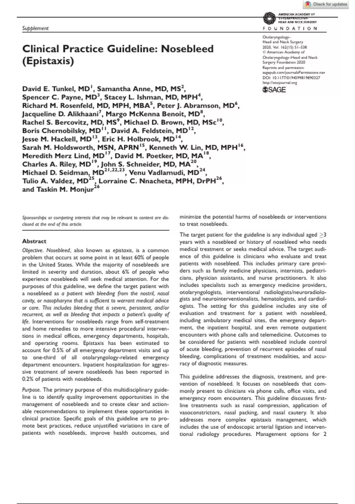 Clinical Practice Guideline: Nosebleed 2020, Vol. 162(1S) S1–S38