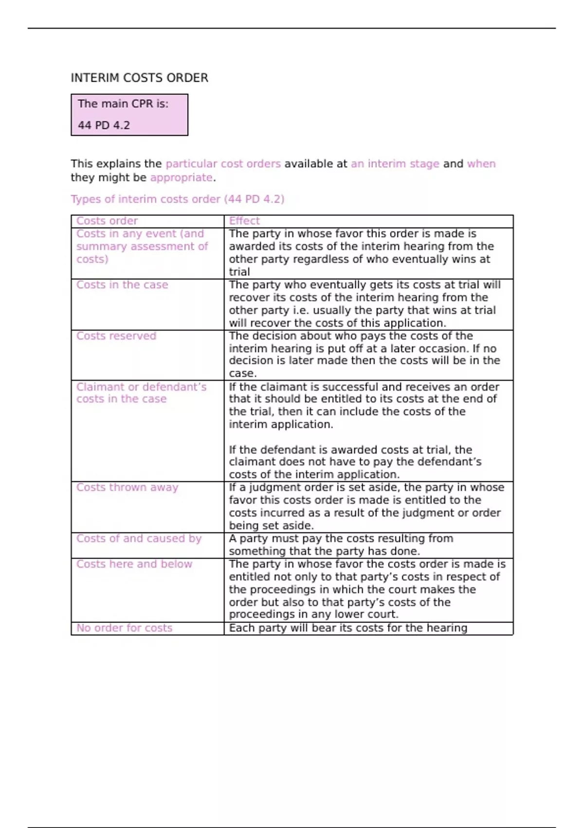 Types of interim costs order (44 PD 4.2)
