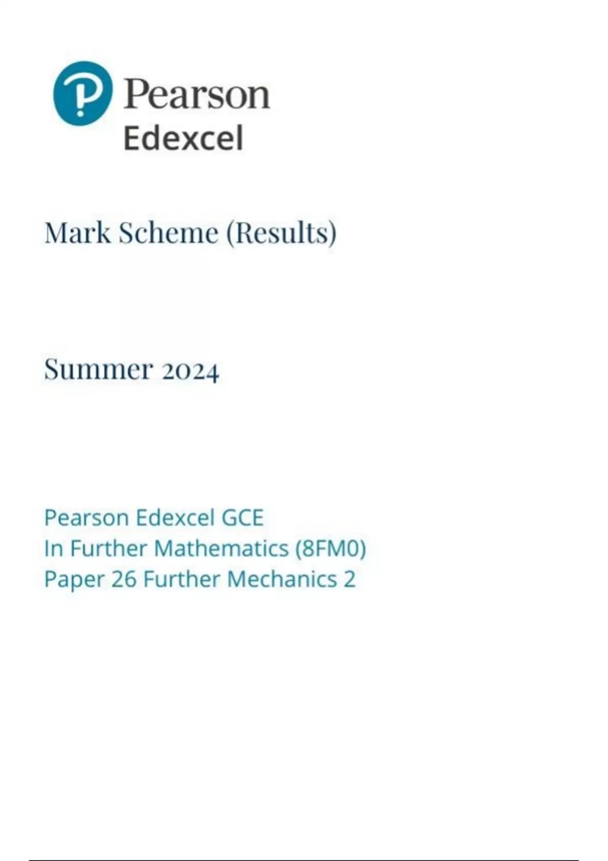 Pearson Edexcel GCE In Further Mathematics (8FM0) Paper 26 Further Mechanics 2 mark scheme June 2024