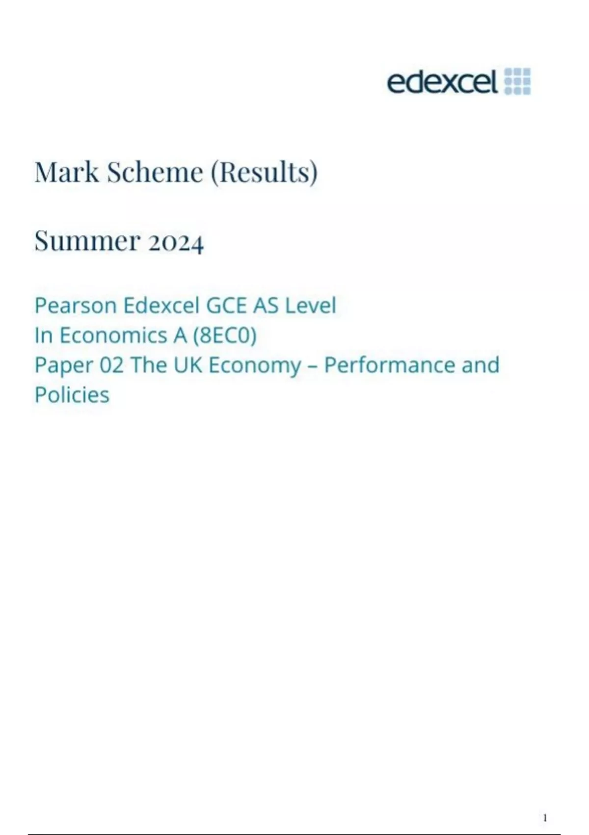 Pearson Edexcel GCE AS Level In Economics A (8EC0) Paper 02 The UK Economy Performance and Policies Question paper and Mark scheme June 2025