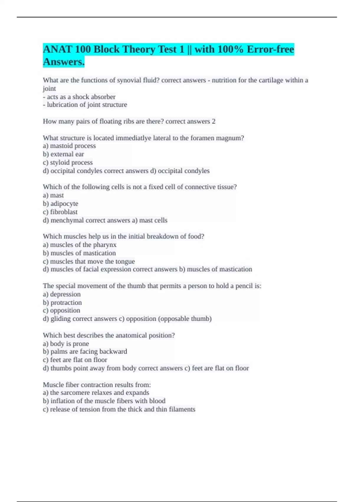 What are the functions of synovial fluid? correct answers - nutrition for the cartilage within a joint - acts as a shock absorber - lubrication of joint structure How many pairs of floating ribs are there? correct answers 2 What structure is located immediatlye lateral to the foramen magnum? a) mastoid process b) external ear c) styloid process d) occipital condyles correct answers d) occipital condyles Which of the following cells is not a fixed cell of connective tissue? a) mast b) adipocyte c) fibroblast d) menchymal correct answers a) mast cells Which muscles help us in the initial breakdown of food? a) muscles of the pharynx b) muscles of mastication c) muscles that move the tongue d) muscles of facial expression correct answers b) muscles of mastication The special movement of the thumb that permits a person to hold a pencil is: a) depression b) protraction c) opposition d) gliding correct answers c) opposition (opposable thumb) Which best describes the anatomical position? a) body is prone b) palms are facing backward c) feet are flat on floor d) thumbs point away from body correct answers c) feet are flat on floor Muscle fiber contraction results from: a) the sarcomere relaxes and expands b) inflation of the muscle fibers with blood c) release of tension from the thick and thin filaments