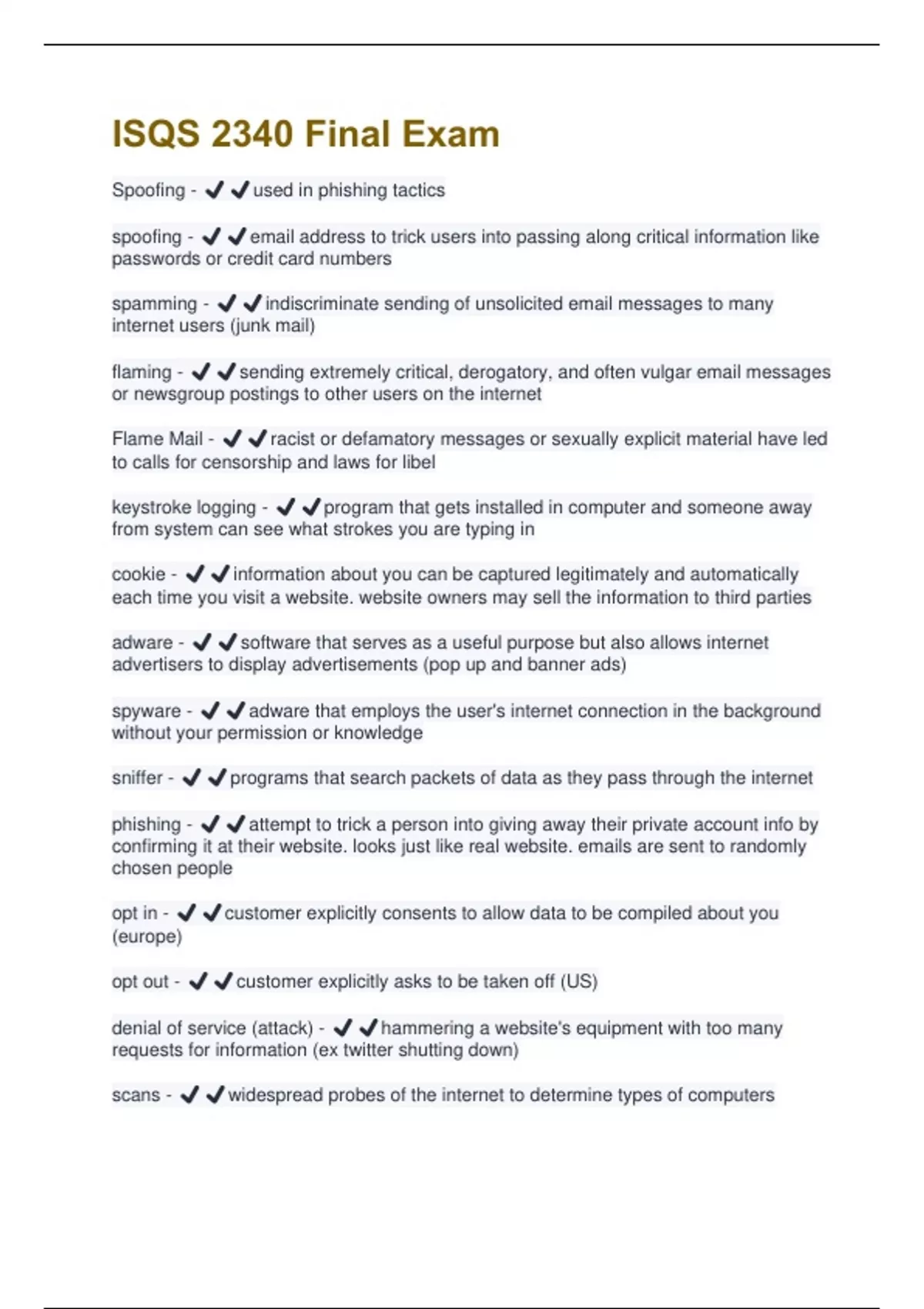 Spoofing - ️️used in phishing tactics spoofing - ️️email address to trick users into passing along critical information like passwords or credit card numbers spamming - ️️indiscriminate sending of unsolicited email messages to many internet users (junk mail) flaming - ️️sending extremely critical, derogatory, and often vulgar email messages or newsgroup postings to other users on the internet Flame Mail - ️️racist or defamatory messages or sexually explicit material have led to calls for censorship and laws for libel keystroke logging - ️️program that gets installed in computer and someone away from system can see what strokes you are typing in cookie - ️️information about you can be captured legitimately and automatically each time you visit a website. website owners may sell the information to third parties adware - ️️software that serves as a useful purpose but also allows internet advertisers to display advertisements (pop up and banner ads) spyware - ️️adware that employs the user's internet connection in the background without your permission or knowledge sniffer - ️️programs that search packets of data as they pass through the internet phishing - ️️attempt to trick a person into giving away their private account info by confirming it at their website. looks just like real website. emails are sent to randomly chosen people opt in - ️️customer explicitly consents to allow data to be compiled about you (europe) opt out - ️️customer explicitly asks to be taken off (US) denial of service (attack) - ️️hammering a website's equipment with too many requests for information (ex twitter shutting down) scans - ️️widespread probes of the internet to determine types of computers