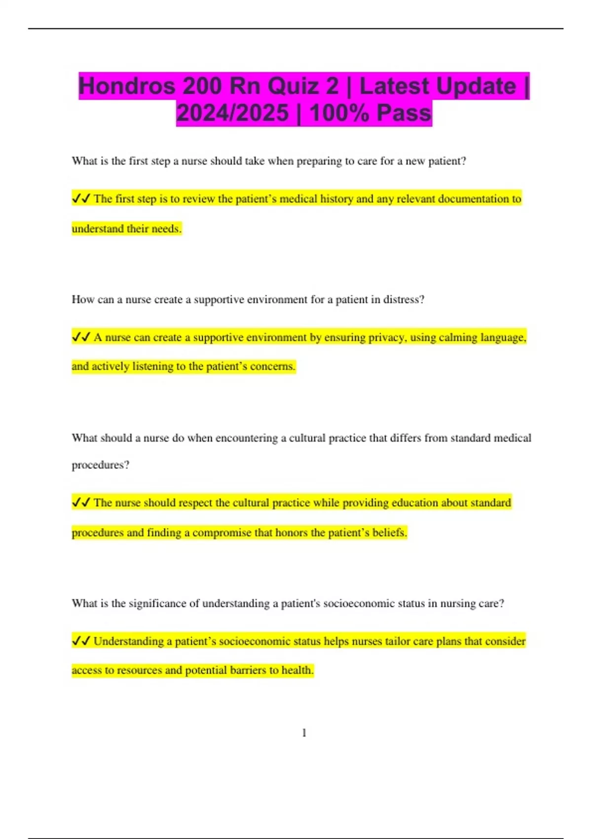 Hondros 200 Rn Quiz 2 | Latest Update | 2024/2025 | 100% Pass What is the first step a nurse should take when preparing to care for a new patient? The first step is to review the patient’s medical history and any relevant documentation to understand their needs. How can a nurse create a supportive environment for a patient in distress? A nurse can create a supportive environment by ensuring privacy, using calming language, and actively listening to the patient’s concerns. What should a nurse do when encountering a cultural practice that differs from standard medical procedures? The nurse should respect the cultural practice while providing education about standard procedures and finding a compromise that honors the patient’s beliefs. What is the significance of understanding a patient's socioeconomic status in nursing care? Understanding a patient’s socioeconomic status helps nurses tailor care plans that consider access to resources and potential barriers to health. 2 How can humor be effectively used in patient care? Humor can be used to alleviate anxiety, build rapport, and create a more relaxed atmosphere, as long as it is appropriate for the situation. What strategies can a nurse use to encourage patient participation in their own care? A nurse can encourage participation by involving the patient in goal-setting and decision- making, fostering a sense of ownership over their health. How should a nurse respond to a patient expressing feelings of hopelessness? The nurse should validate the patient's feelings, offer support, and refer them to mental health resources if necessary. What is the value of conducting a functional assessment for elderly patients? Conducting a functional assessment helps determine the patient's ability to perform daily activities and identify areas where they may need assistance. How can a nurse help a patient develop healthy coping mechanisms? A nurse can help by teaching stress management techniques, encouraging physical activity, and providing resources for counseling or support groups. 3 What considerations should a nurse keep in mind when caring for patients with chronic illnesses? A nurse should consider the patient’s ongoing management needs, lifestyle adjustments, and the impact of the illness on their mental and emotional health. What techniques can be used to effectively communicate with a patient who has limited English proficiency? Techniques include using simple language, visual aids, and professional interpreters to ensure clear understanding. How can storytelling be a beneficial