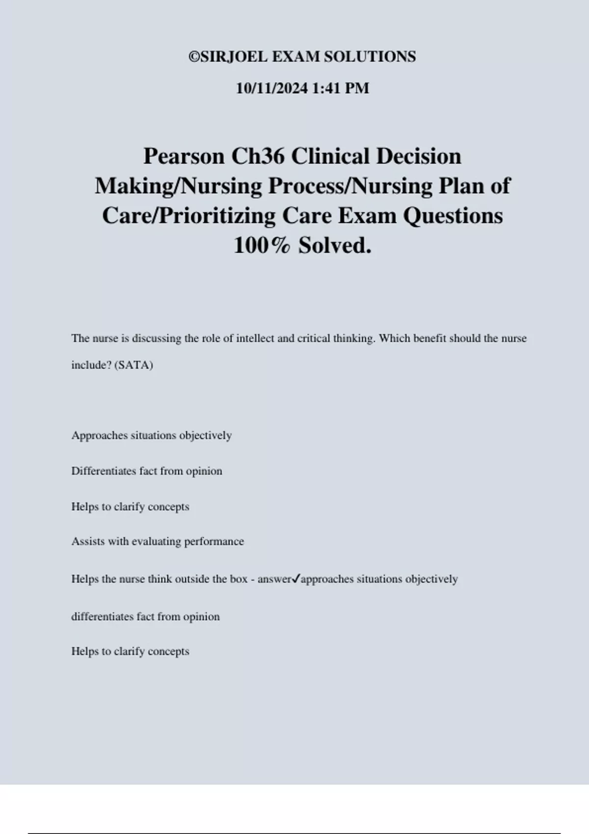 Helps the nurse think outside the box - answer✔approaches situations objectively