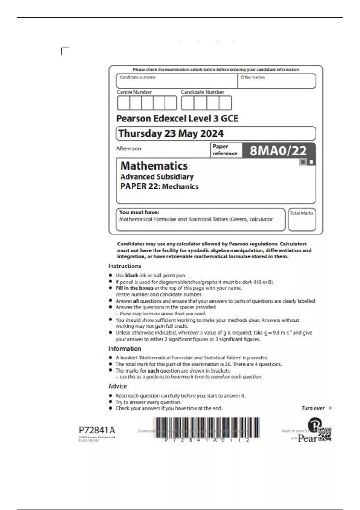 Exam of 12 pages for the course Unit M1 - Mechanics 1 at PEARSON (edexcel mechanics)