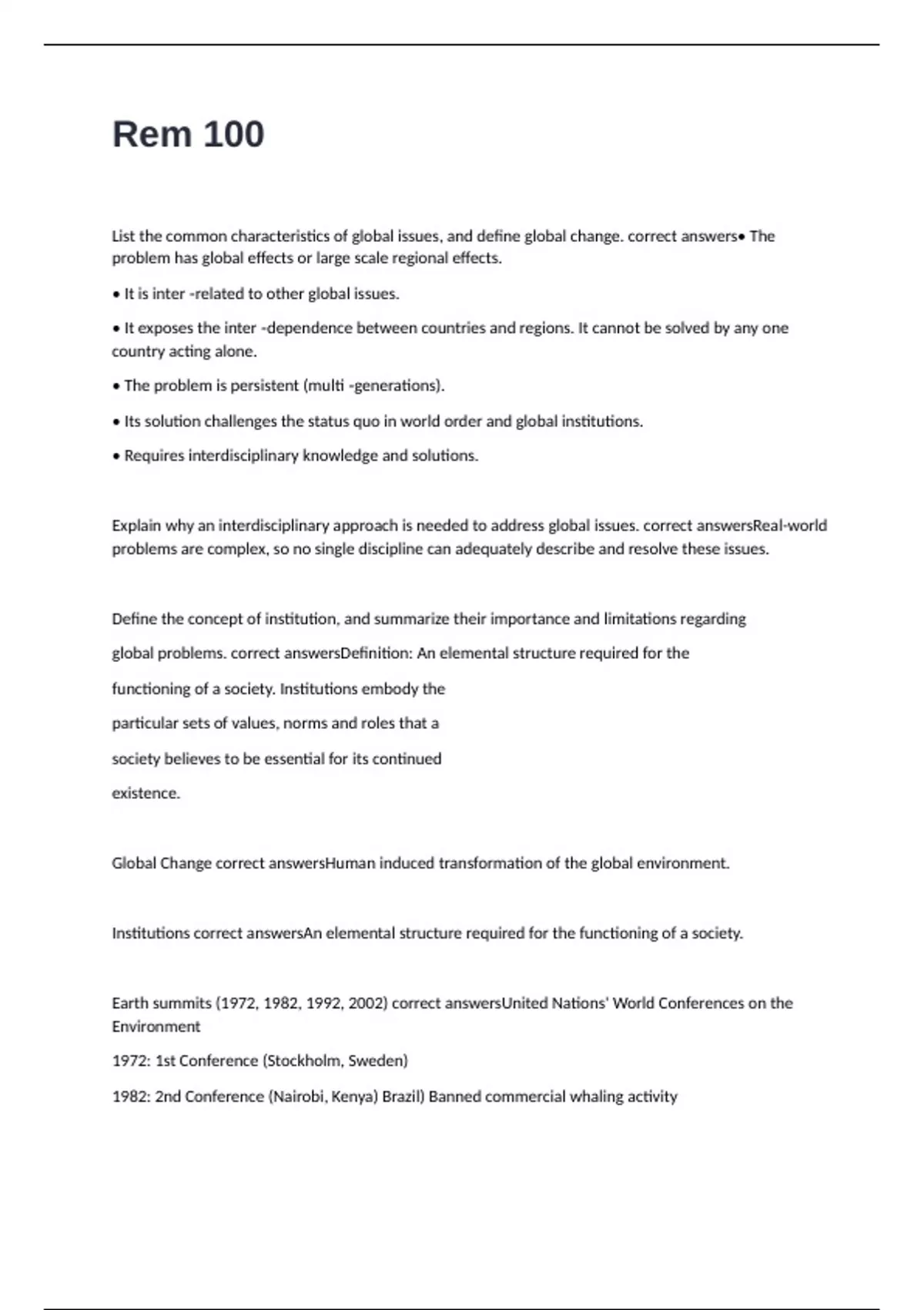 Earth summits (1972, 1982, 1992, 2002) correct answersUnited Nations' World Conferences on the