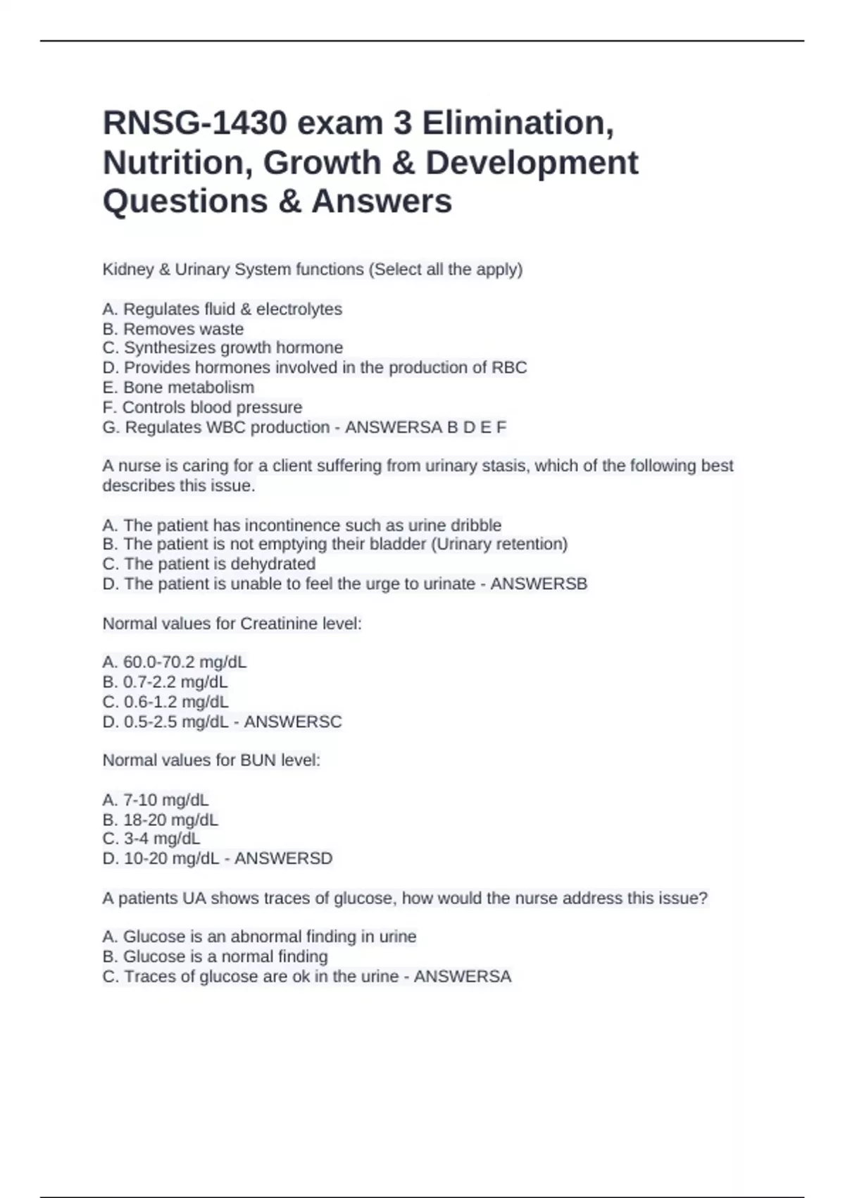 Kidney & Urinary System functions (Select all the apply) A. Regulates fluid & electrolytes B. Removes waste C. Synthesizes growth hormone D. Provides hormones involved in the production of RBC E. Bone metabolism F. Controls blood pressure G. Regulates WBC production - ANSWERSA B D E F A nurse is caring for a client suffering from urinary stasis, which of the following best describes this issue. A. The patient has incontinence such as urine dribble B. The patient is not emptying their bladder (Urinary retention) C. The patient is dehydrated D. The patient is unable to feel the urge to urinate - ANSWERSB Normal values for Creatinine level: A. 60.0-70.2 mg/dL B. 0.7-2.2 mg/dL C. 0.6-1.2 mg/dL D. 0.5-2.5 mg/dL - ANSWERSC Normal values for BUN level: A. 7-10 mg/dL B. 18-20 mg/dL C. 3-4 mg/dL D. 10-20 mg/dL - ANSWERSD A patients UA shows traces of glucose, how would the nurse address this issue? A. Glucose is an abnormal finding in urine B. Glucose is a normal finding C. Traces of glucose are ok in the urine - ANSWERSA A nurse is monitoring a patients I & O. The patient had the following input and output: 4oz Ice chips, 400ml IV fluid, 800ml foley urine, 8oz water, 60ml feces & 4oz OJ. What is the patients total input and output? A. 880ml input & 860ml output B. 870ml input & 850ml output C. 820ml input & 860ml output D. 700ml inout & 800ml output - ANSWERSC Which test helps identify a disruption in kidney function and can help in diagnosing diabetes, UTI, hematuria and proteinuria? A. PSA (Prostate specific antigen) B. CMP (Comprehensive metabolic panel) C. CBC (Complete blood count) D. UA & Urine culture (Urinalysis) - ANSWERSD A nurse has been caring for a patient that suffered from urinary retention. The nurse knows the patients urinary retention has subsided when which of the following occurs? A. The patient is voiding 30mL of urine per hour B. The patient is voiding 30mL of urine per 8 hours C. The patient has constant dribbling urine D. The patient has incontinence - ANSWERSA What is the normal adult bladder capacity? A. 50 to 100 mL B. 100 to 200 mL C. 300 to 500 mL D. 600 to 800 mL - ANSWERSC A patient who has come into the clinic is experiencing incontinence, what patient teaching could the nurse implement when teaching the patient risk factors? A. A diet high in fiber can cause incontinence B. Caffeine can decrease the elasticity of sphincter C. Cranberry juice causes UTIs D. The patient probably has cancer - ANSWERSB A 24-hour urine collection is scheduled to start at 0100. When should the nurse start the procedure? A. At 0100, with or without a specimen B. At the first specimen that was voided at 0400 C. 2 hours after the urine was discarded D. After discarding the 0100 specimen - ANSWERSD A nurse is caring for a patient who is experiencing diarrhea. Which of the following nursing interventions would be appropriate? A. Administer physician ordered PRN PO ibuprofen B. Provide bed pan for patient C. Increase patients fluid and fiber intake D. Contact doctor immediately - ANSWERSC A 52 y/o old male is seen in the clinic for his yearly check-up, what tests could the nurse expect to see ordered by the physician to test for Benign Prostate Hypertrophy (BPH) A. Metabolic panel B. DRE and PSA C. CBC D. UA - ANSWERSB 3. A patient has developed edema in her lower legs and feet, prompting her physician to prescribe furosemide (Lasix), a diuretic medication. After the client has begun this new medication, what should the nurse anticipate? A. A risk of urinary tract infections B. Increased urine concentration C. Increased output of dilute urine D. Transient incontinence and increased urine production - ANSWERSC Which of the following describes the term micturition? A. Emptying the bladder B. Catheterizing the bladder C. Collecting a urine specimen D. Experiencing total incontinence - ANSWERSA 7. A nurse is caring for older adult clients in an assisted-living facility. Which effect of aging should the nurse consider when performing a urinary assessment? A. The diminished ability of the kidneys to concentrate urine may result in urinary tract infection. B. Increased bladder muscle tone may reduce the capacity of the bladder to hold urine, resulting in frequency. C. Decreased bladder contractility may lead to urine retention and stasis, which increase the likelihood of urinary tract infection. D. Neuromuscular problems may result in the client finding urinary control too much trouble, resulting in incontinence. - ANSWERSC