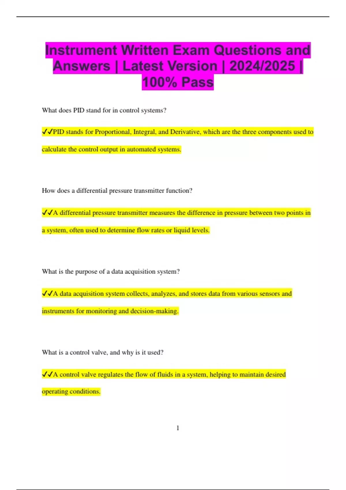 Instrument Written Exam Questions and Answers | Latest Version | 2024/2025 | 100% Pass What does PID stand for in control systems? PID stands for Proportional, Integral, and Derivative, which are the three components used to calculate the control output in automated systems. How does a differential pressure transmitter function? A differential pressure transmitter measures the difference in pressure between two points in a system, often used to determine flow rates or liquid levels. What is the purpose of a data acquisition system? A data acquisition system collects, analyzes, and stores data from various sensors and instruments for monitoring and decision-making. What is a control valve, and why is it used? A control valve regulates the flow of fluids in a system, helping to maintain desired operating conditions. 2 How can environmental conditions impact instrument performance? Environmental conditions like temperature, humidity, and pressure can influence the sensitivity and accuracy of measurement instruments. What does a loop calibrator do? A loop calibrator is used to test and calibrate control loops, ensuring that the instrument and controller work together effectively. What are some common types of sensors used in industrial applications? Common sensors include thermocouples, pressure sensors, flow sensors, and level sensors, each tailored to specific measurement needs. What is the significance of safety protocols in instrument handling? Safety protocols are essential to protect personnel from hazards associated with operating and maintaining instrumentation equipment. What is a flowmeter, and what does it measure? A flowmeter measures the flow rate of liquids or gases within a system, providing crucial data for process control. 3 What is the purpose of using a pressure gauge? A pressure gauge measures the pressure of gases or liquids in a system, helping to ensure operational efficiency and safety. What factors can affect the accuracy of an instrument? Factors such as temperature fluctuations, humidity, electromagnetic interference, and instrument calibration can all affect measurement accuracy. What is the difference between an analog and a digital instrument? An analog instrument displays readings using a continuous scale, while a digital instrument presents measurements in numerical form