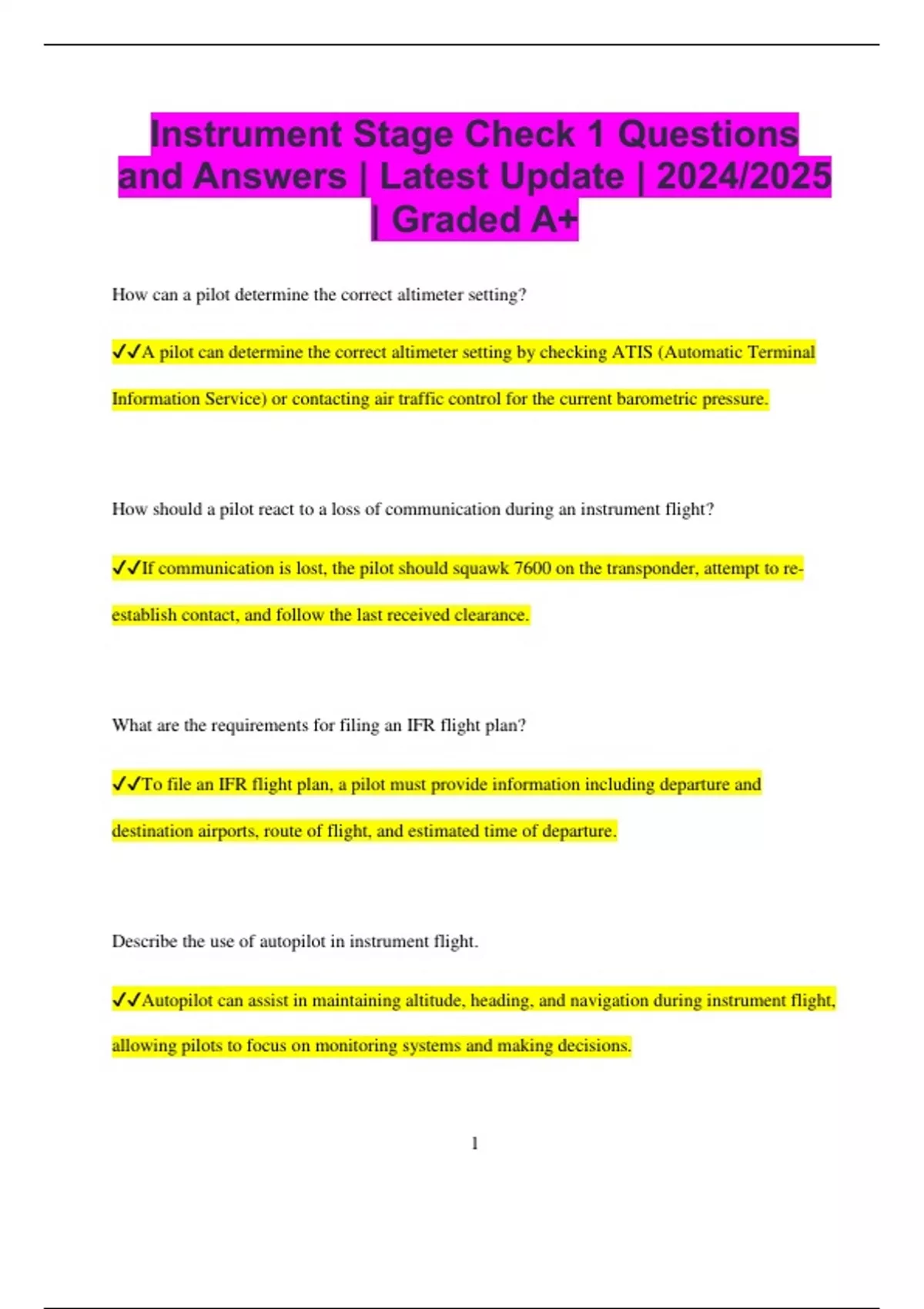 Instrument Stage Check 1 Questions and Answers | Latest Update | 2024/2025 | Graded A+ How can a pilot determine the correct altimeter setting? A pilot can determine the correct altimeter setting by checking ATIS (Automatic Terminal Information Service) or contacting air traffic control for the current barometric pressure. How should a pilot react to a loss of communication during an instrument flight? If communication is lost, the pilot should squawk 7600 on the transponder, attempt to re- establish contact, and follow the last received clearance. What are the requirements for filing an IFR flight plan? To file an IFR flight plan, a pilot must provide information including departure and destination airports, route of flight, and estimated time of departure. Describe the use of autopilot in instrument flight. Autopilot can assist in maintaining altitude, heading, and navigation during instrument flight, allowing pilots to focus on monitoring systems and making decisions. 2 What is the importance of the standard temperature lapse rate? The standard temperature lapse rate helps pilots predict how temperature changes with altitude, which is essential for understanding aircraft performance. How do pilots determine the visibility requirements for an instrument approach? Pilots refer to the approach plate to determine visibility requirements, which may vary based on the type of approach and local regulations. What does a holding pattern look like on a chart? A holding pattern is depicted as a racetrack-shaped course on a chart, indicating the direction of turns and the entry point for the hold. What is the difference between a precision and a non-precision approach? A precision approach provides both lateral and vertical guidance, while a non-precision approach only offers lateral guidance. How can a pilot manage workload during busy air traffic situations? Pilots can manage workload by prioritizing tasks, using checklists, and effectively communicating with air traffic control to ensure safety and efficiency. 3 What is the role of a NOTAM in flight planning? A NOTAM (Notice to Airmen) provides important information about temporary changes in airspace or conditions that may affect flight safety. How should a pilot handle turbulence during an instrument flight? Pilots should maintain control of the aircraft, reduce airspeed as necessary, and follow procedures to safely navigate through turbulent conditions. What is the primary purpose of a transponder?