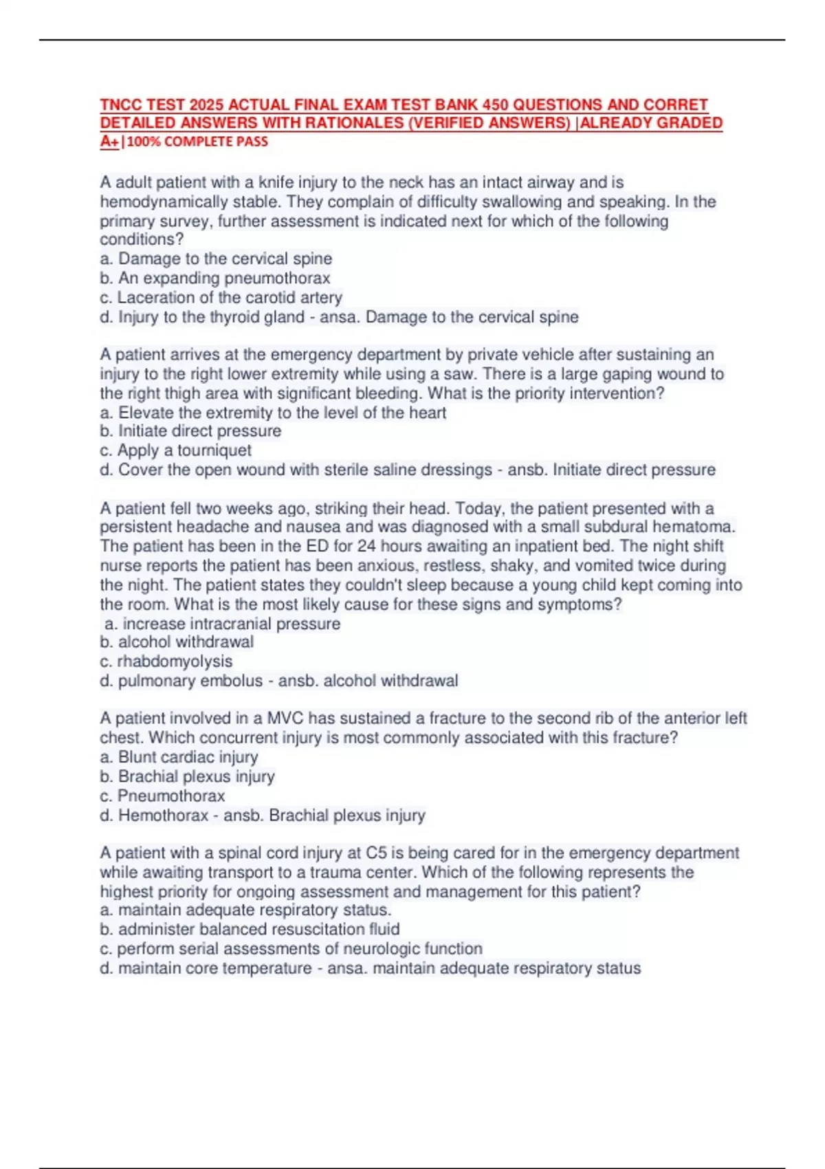 TNCC TEST 2025 ACTUAL FINAL EXAM TEST BANK 450 QUESTIONS AND CORRET DETAILED ANSWERS