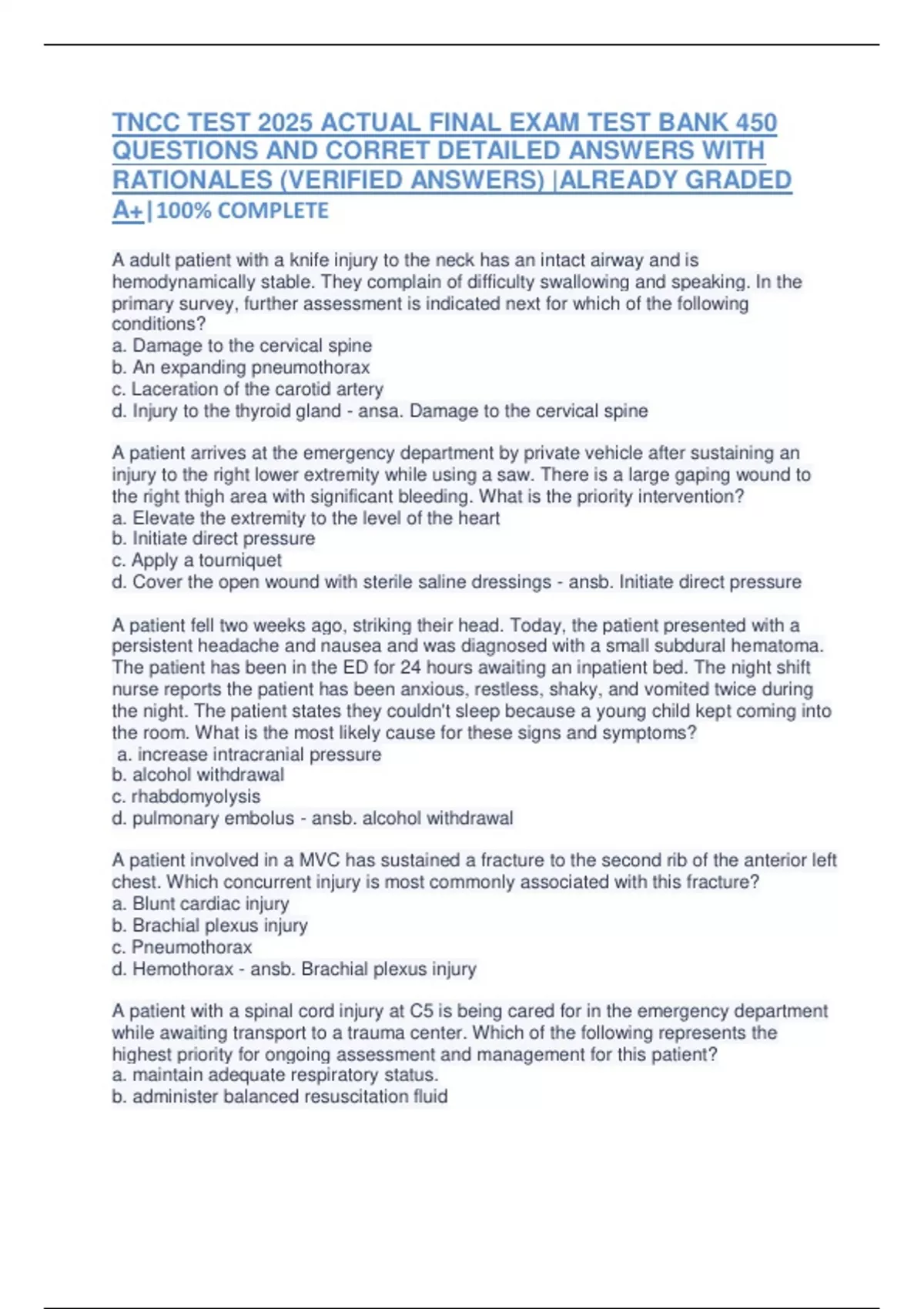 , TNCC TEST 2025 ACTUAL FINAL EXAM TEST BANK 450
