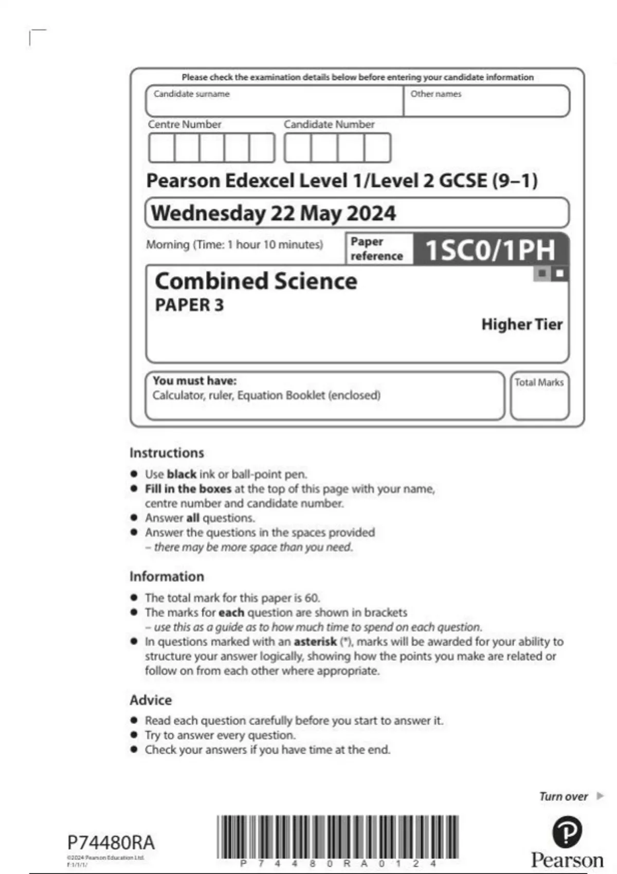 Pearson Edexcel Level 1/Level 2 GCSE (9–1) Combined Science PAPER 3 Higher Tier 1SC0/1PH question paper june 2024
