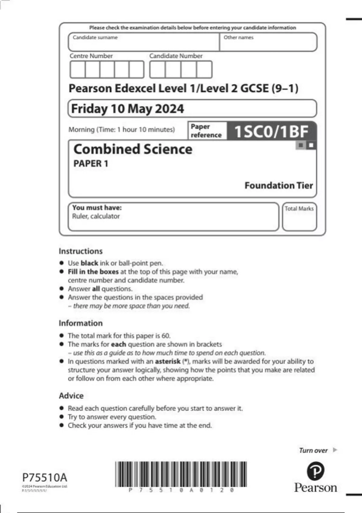 Pearson Edexcel Level 1/Level 2 GCSE (9–1) Combined Science PAPER 1 Foundation Tier 1SC0/1BF question paper june 2024