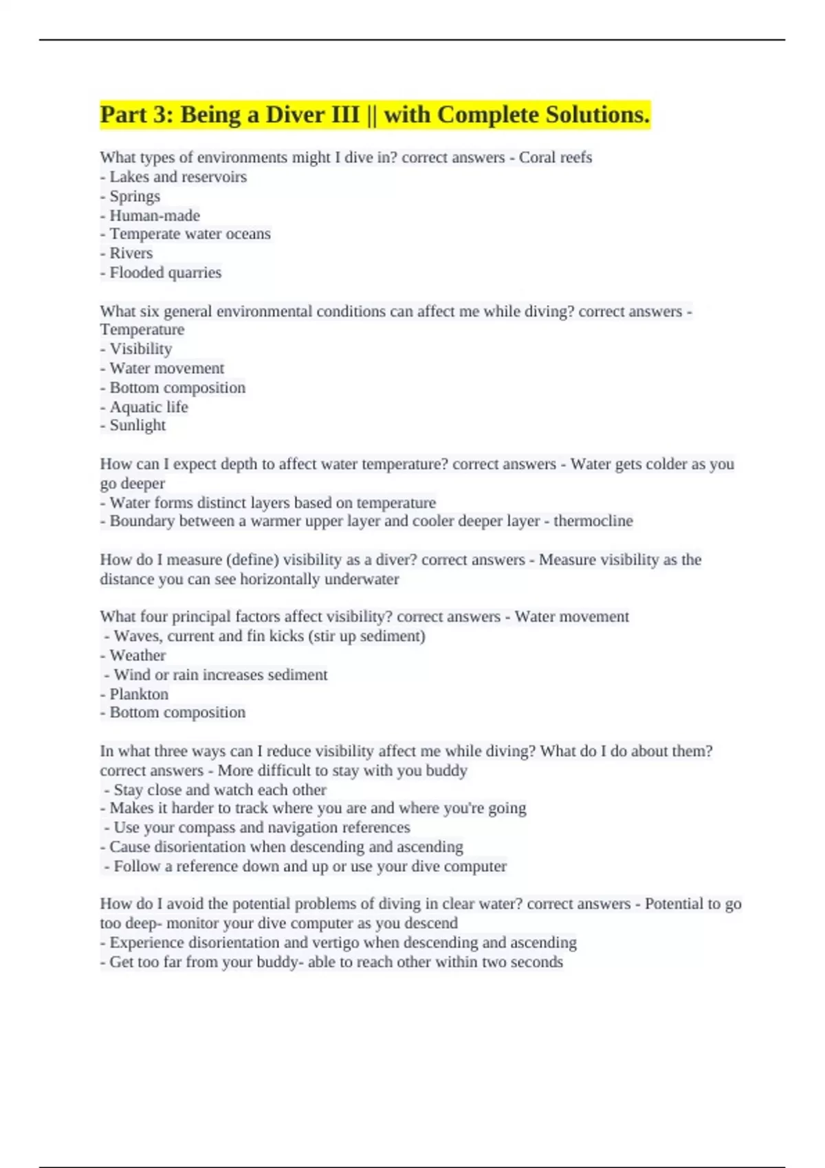 What types of environments might I dive in? correct answers - Coral reefs - Lakes and reservoirs - Springs - Human-made - Temperate water oceans - Rivers - Flooded quarries What six general environmental conditions can affect me while diving? correct answers - Temperature - Visibility - Water movement - Bottom composition - Aquatic life - Sunlight How can I expect depth to affect water temperature? correct answers - Water gets colder as you go deeper - Water forms distinct layers based on temperature - Boundary between a warmer upper layer and cooler deeper layer - thermocline How do I measure (define) visibility as a diver? correct answers - Measure visibility as the distance you can see horizontally underwater What four principal factors affect visibility? correct answers - Water movement - Waves, current and fin kicks (stir up sediment) - Weather - Wind or rain increases sediment - Plankton - Bottom composition In what three ways can I reduce visibility affect me while diving? What do I do about them? correct answers - More difficult to stay with you buddy - Stay close and watch each other - Makes it harder to track where you are and where you're going - Use your compass and navigation references - Cause disorientation when descending and ascending - Follow a reference down and up or use your dive computer How do I avoid the potential problems of diving in clear water? correct answers - Potential to go too deep- monitor your dive computer as you descend - Experience disorientation and vertigo when descending and ascending - Get too far from your buddy- able to reach other within two seconds
