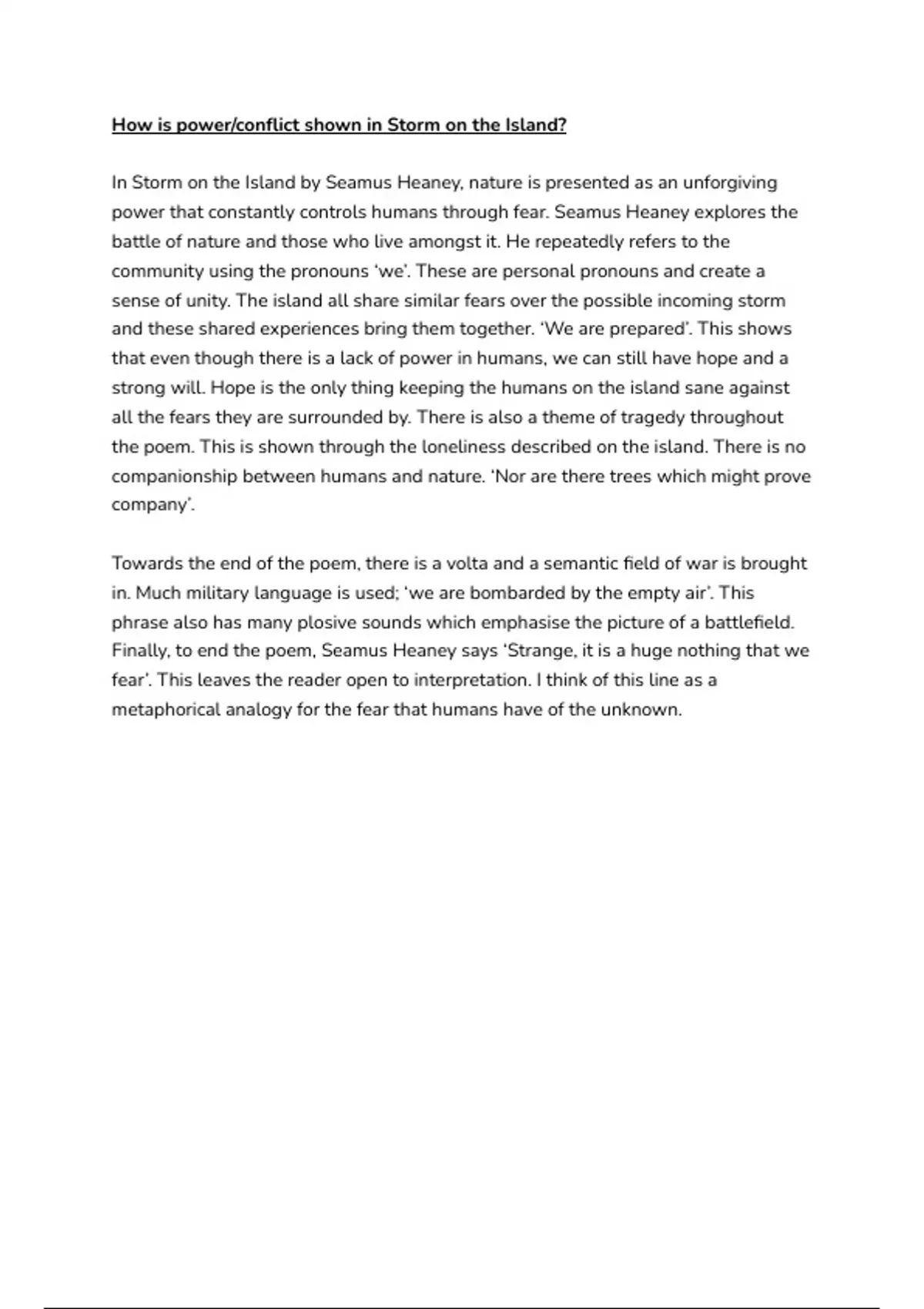 Detailed analysis and contextual notes about Storm on the Island, a poem written by Seamus Heaney. These notes can be used for revision purposes and aid when answering AQA English GCSE questions about the portrayal of power and conflict in poems. It includes key quotes and their significance