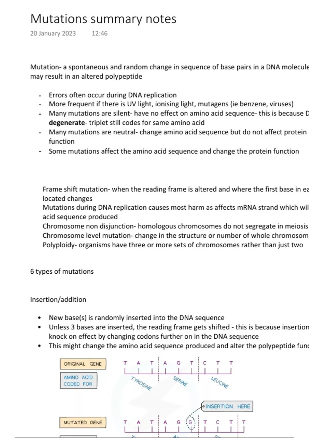 Mutation- a spontaneous and random change in sequence of base pairs in a DNA molecule