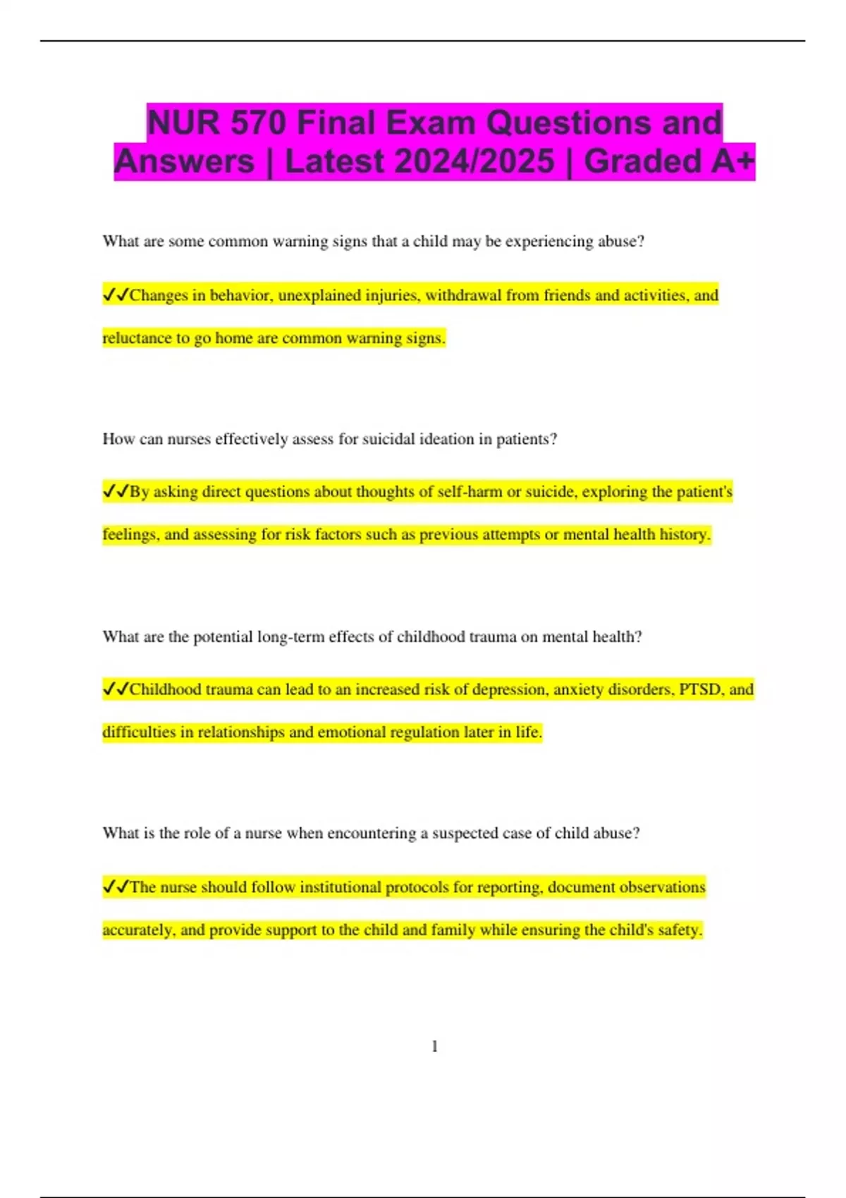 NUR 570 Final Exam Questions and Answers | Latest 2024/2025 | Graded A+ What are some common warning signs that a child may be experiencing abuse? Changes in behavior, unexplained injuries, withdrawal from friends and activities, and reluctance to go home are common warning signs. How can nurses effectively assess for suicidal ideation in patients? By asking direct questions about thoughts of self-harm or suicide, exploring the patient's feelings, and assessing for risk factors such as previous attempts or mental health history. What are the potential long-term effects of childhood trauma on mental health? Childhood trauma can lead to an increased risk of depression, anxiety disorders, PTSD, and difficulties in relationships and emotional regulation later in life. What is the role of a nurse when encountering a suspected case of child abuse? The nurse should follow institutional protocols for reporting, document observations accurately, and provide support to the child and family while ensuring the child's safety. 2 How can healthcare providers support families dealing with the impact of suicide? By offering counseling resources, creating a supportive environment for open communication, and providing education about grief and mental health resources. What interventions can be employed to reduce the risk of suicide in adolescents? Establishing strong support networks, providing access to mental health services, and promoting open discussions about mental health can help reduce suicide risk. What are some ethical considerations when working with victims of child abuse? Maintaining confidentiality while ensuring the child's safety, obtaining informed consent, and being sensitive to the victim's emotional state are critical ethical considerations. How does cultural background influence perceptions of child abuse? Cultural beliefs and values can shape how abuse is defined, recognized, and addressed, affecting reporting behaviors and support systems available to victims. What is the significance of conducting a thorough risk assessment for suicidal patients? A thorough risk assessment helps identify the severity of suicidal thoughts, underlying mental health issues, and protective factors, guiding effective intervention strategies. 3 What community resources can assist families in crisis situations related to child abuse or suicide? Community resources may include hotlines, counseling services, support groups, and local child protective services that provide immediate assistance