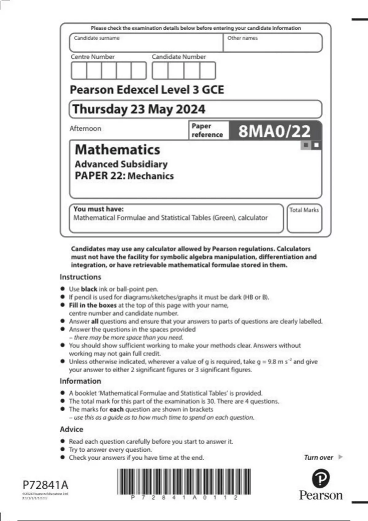 Pearson Edexcel Level 3 GCE Mathematics Advanced Subsidiary PAPER 22: Mechanics 8MA0/22 question paper june 2024