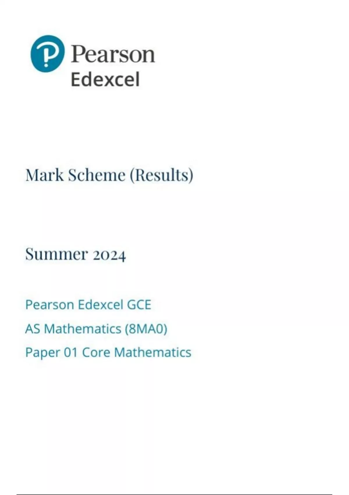 Pearson Edexcel GCE AS Mathematics (8MA0) Paper 01 Core Mathematics mark scheme june 2024 8ma0-01