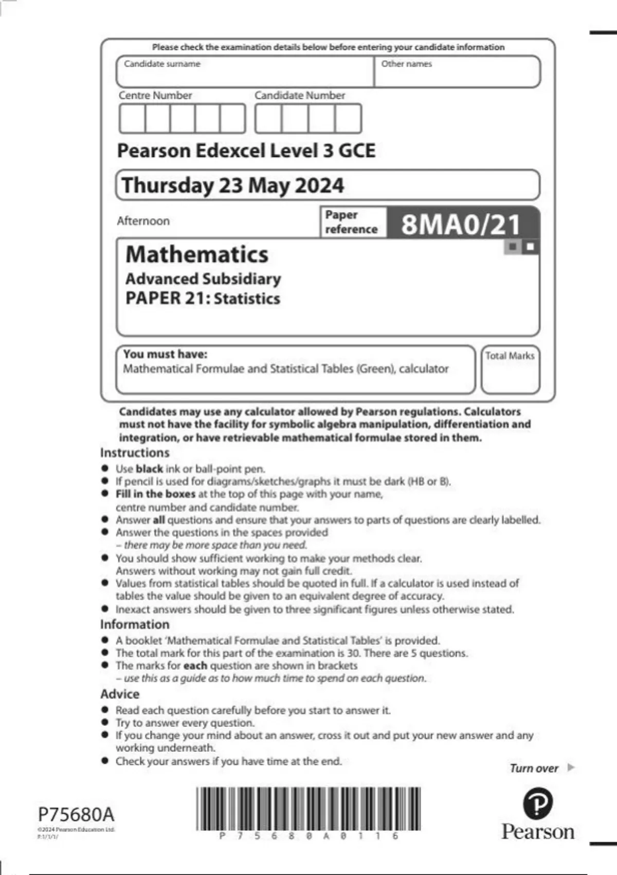 Pearson Edexcel Level 3 GCE Mathematics Advanced Subsidiary PAPER 21: Statistics question paper june 2024 8ma0-21