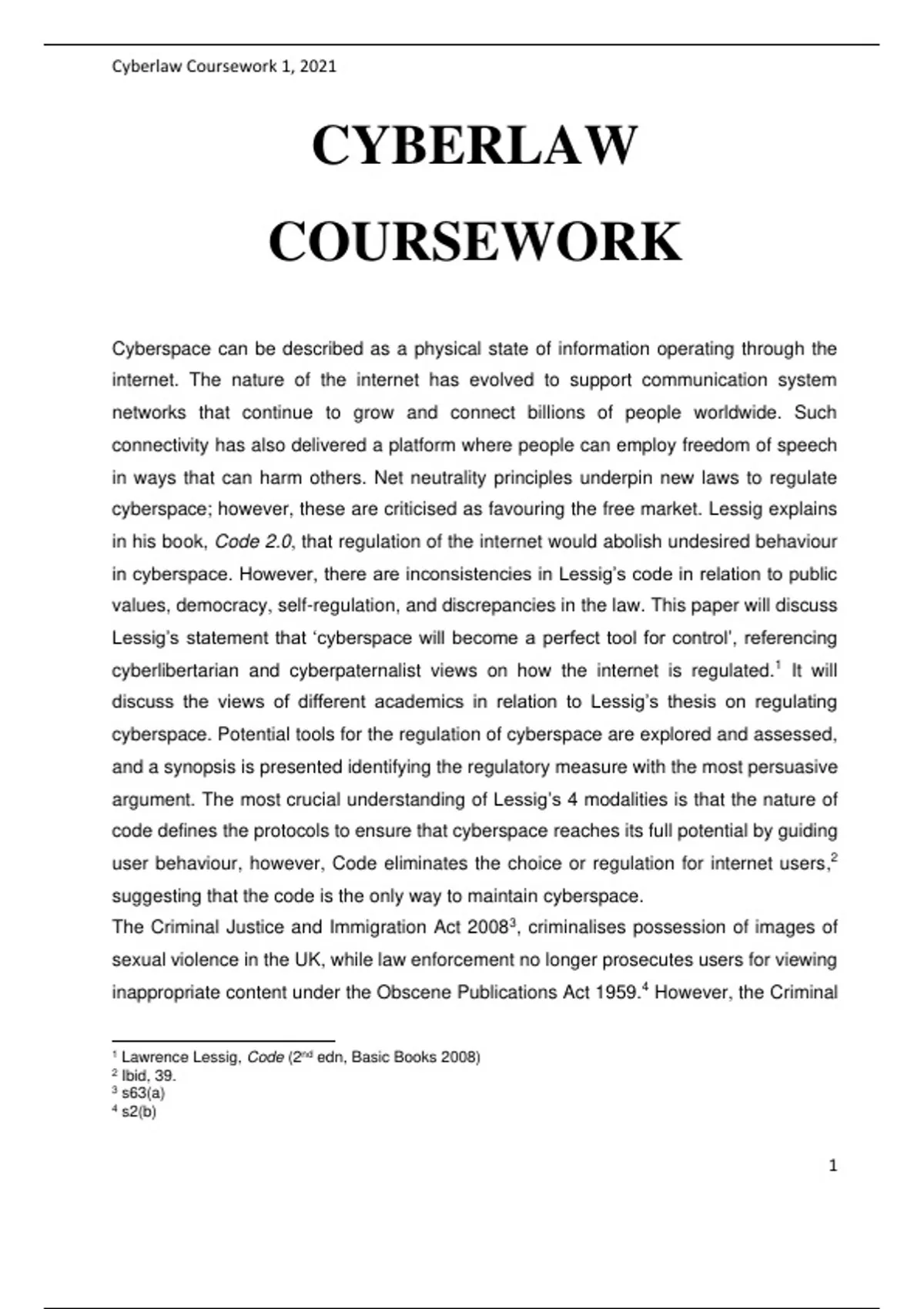 Overview: This essay, awarded 78% (Upper Second Class, 2:1), provides a comprehensive analysis of key topics within Cyberlaw, focusing on the intersection of law, technology, and society. It demonstrates a strong understanding of the legal principles that govern digital platforms, online activities, and emerging technologies. The paper is an excellent resource for students studying Cyberlaw, data protection, cybersecurity, and intellectual property law, offering a well-researched and critically analyzed approach to contemporary legal challenges in the digital age.