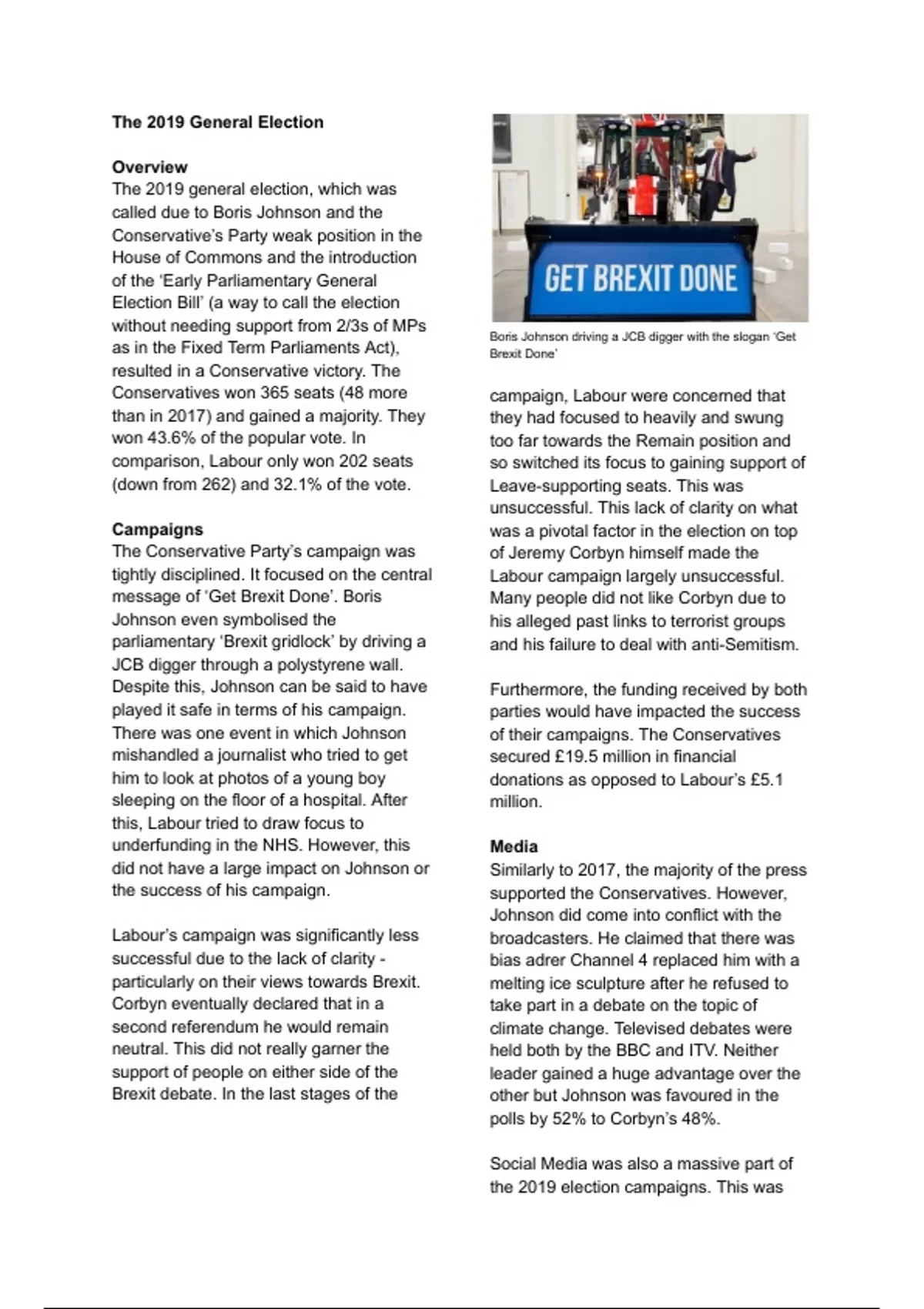 This document gives an overview of the 2019 General Election which can be used as a specific case study/example for A Level Politics essays. It covers the outcome of the election (with specific statistics), the campaigns of political parties, the role of the media, the policies of the Conservative and Labour party, and the wider political context of the election.