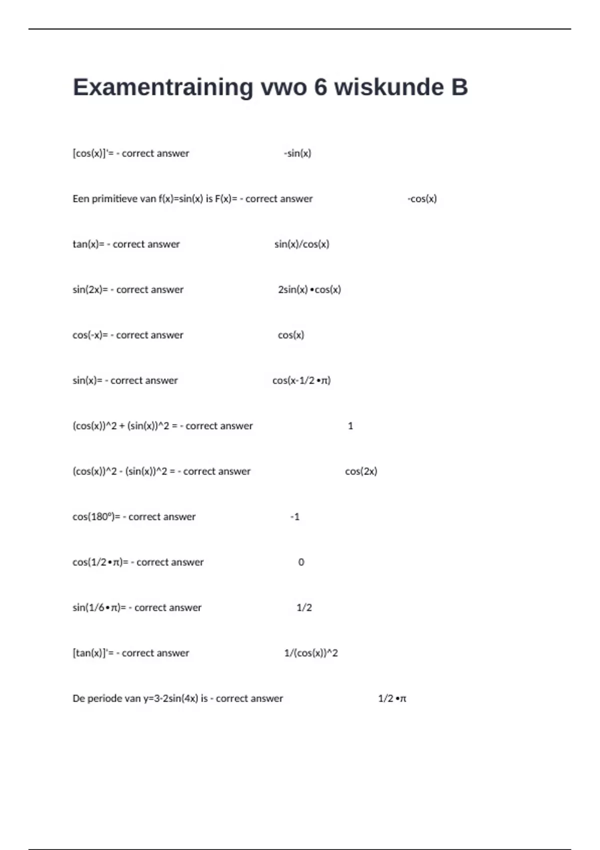 [cos(x)]'= - correct answer -sin(x) Een primitieve van f(x)=sin(x) is F(x)= - correct answer -cos(x) tan(x)= - correct answer sin(x)/cos(x) sin(2x)= - correct answer 2sin(x)∙cos(x) cos(-x)= - correct answer cos(x) sin(x)= - correct answer cos(x-1/2∙π) (cos(x))^2 + (sin(x))^2 = - correct answer 1 (cos(x))^2 - (sin(x))^2 = - correct answer cos(2x) cos(180°)= - correct answer -1 cos(1/2∙π)= - correct answer 0 sin(1/6∙π)= - correct answer 1/2 [tan(x)]'= - correct answer 1/(cos(x))^2 De periode van y=3-2sin(4x) is - correct answer 1/2∙π De evenwichtsstand van y=3-2sin(4x) is - correct answer 3 De amplitude van y=3-2sin(4x) is - correct answer 2 [sin(2x)]'= - correct answer 2cos(2x)