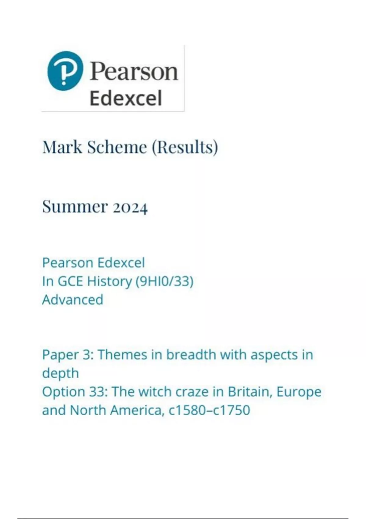 Pearson Edexcel In GCE History (9HI0/33) Advanced Paper 3: Themes in breadth with aspects in depth Option 33: The witch craze in Britain, Europe and North America, c1580–c1750 mark scheme june 2024 9hi0-33