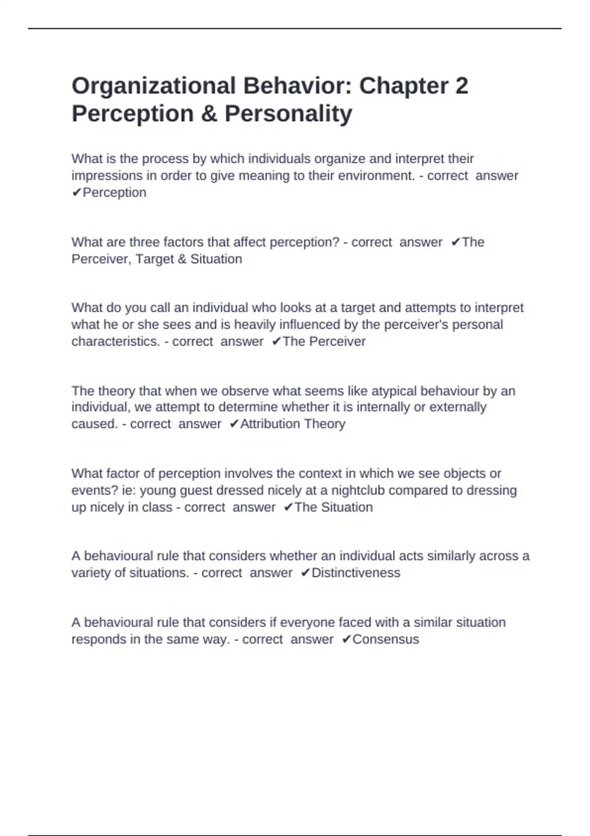 Organizational Behavior Question and answers correctly solved Organizational Behavior: Chapter 2 Perception & Personality What is the process by which individuals organize and interpret their impressions in order to give meaning to their environment. - correct answer Perception What are three factors that affect perception? - correct answer The Perceiver, Target & Situation What do you call an individual who looks at a target and attempts to interpret what he or she sees and is heavily influenced by the perceiver's personal characteristics. - correct answer The Perceiver The theory that when we observe what seems like atypical behaviour by an individual, we attempt to determine whether it is internally or externally caused. - correct answer Attribution Theory What factor of perception involves the context in which we see objects or events? ie: young