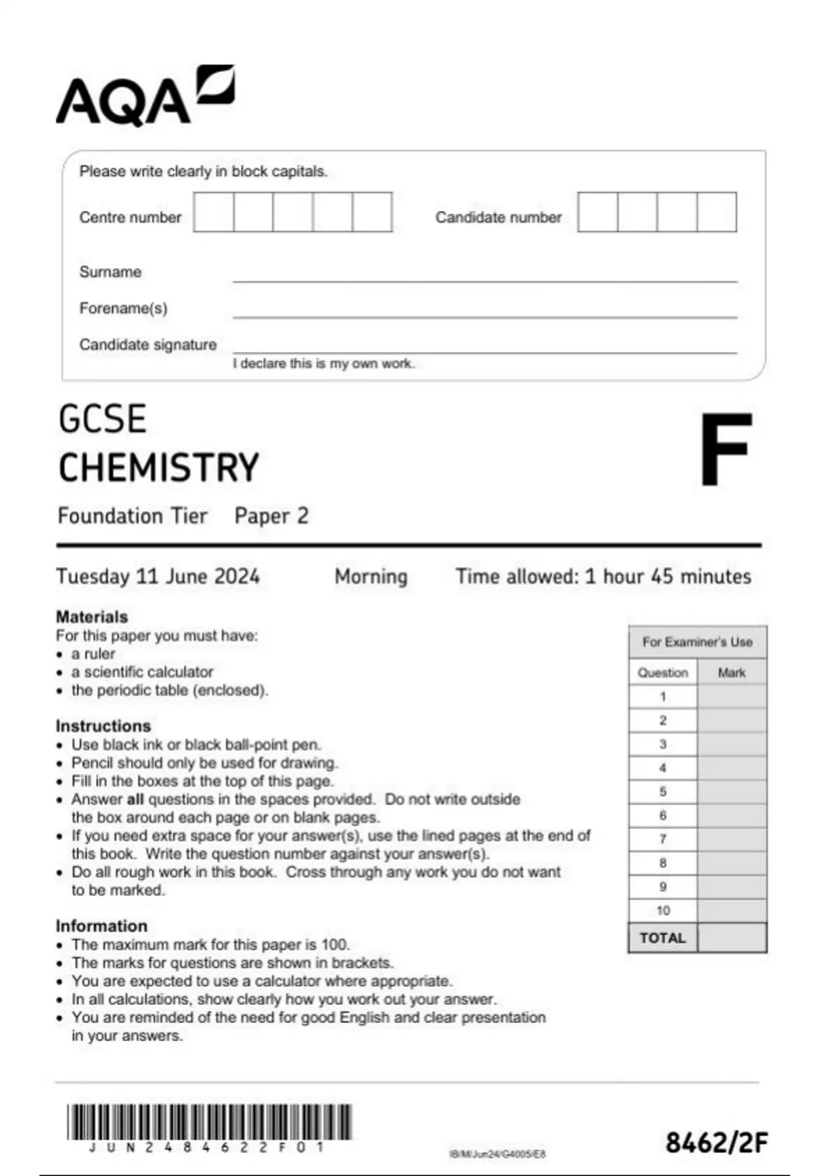 AQA GCSE CHEMISTRY Foundation Tier Paper 2 8462/2f question paper june 2024