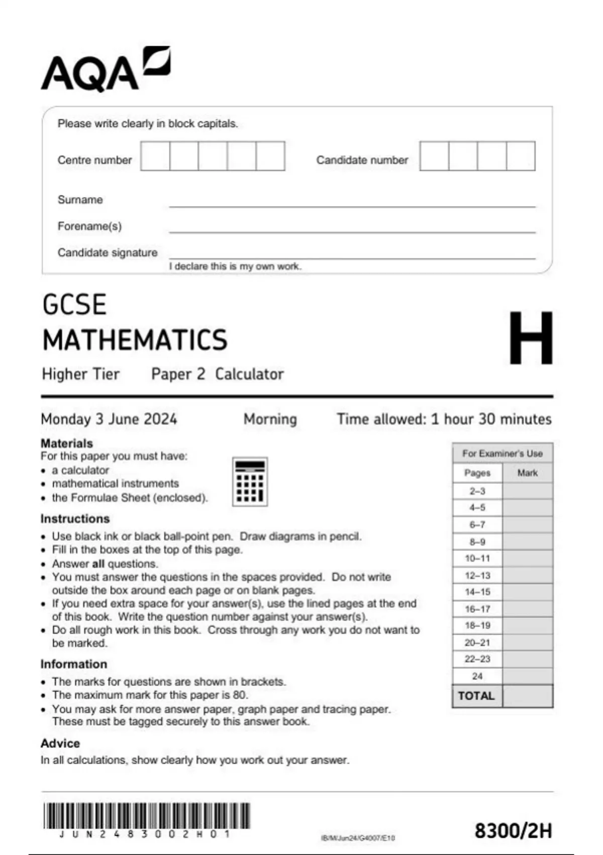 AQA GCSE MATHEMATICS Higher Tier Paper 2 Calculator 8300/2h question paper june 2024