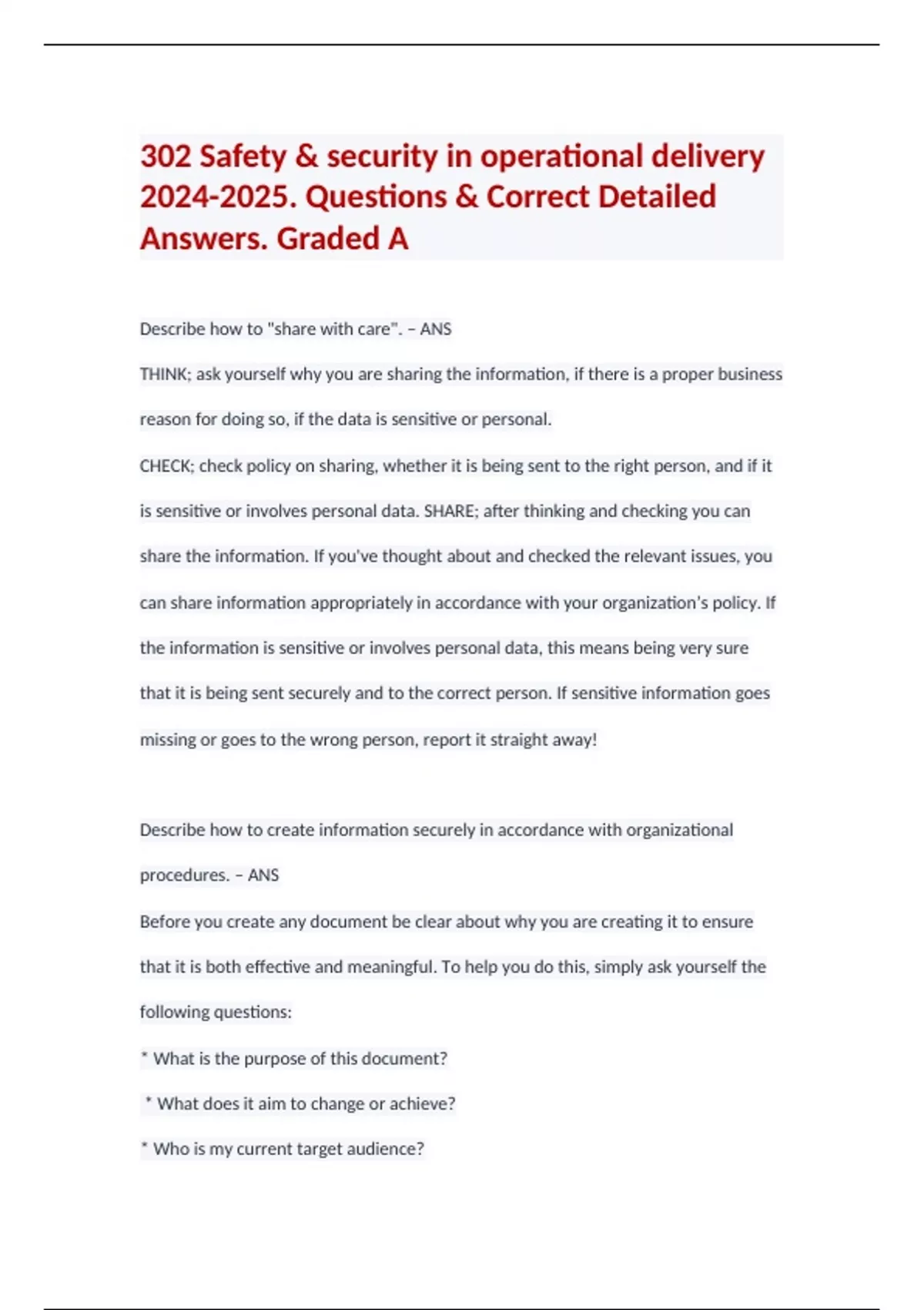 302 Safety & security in operational delivery . Questions & Correct Detailed Answers. Graded A