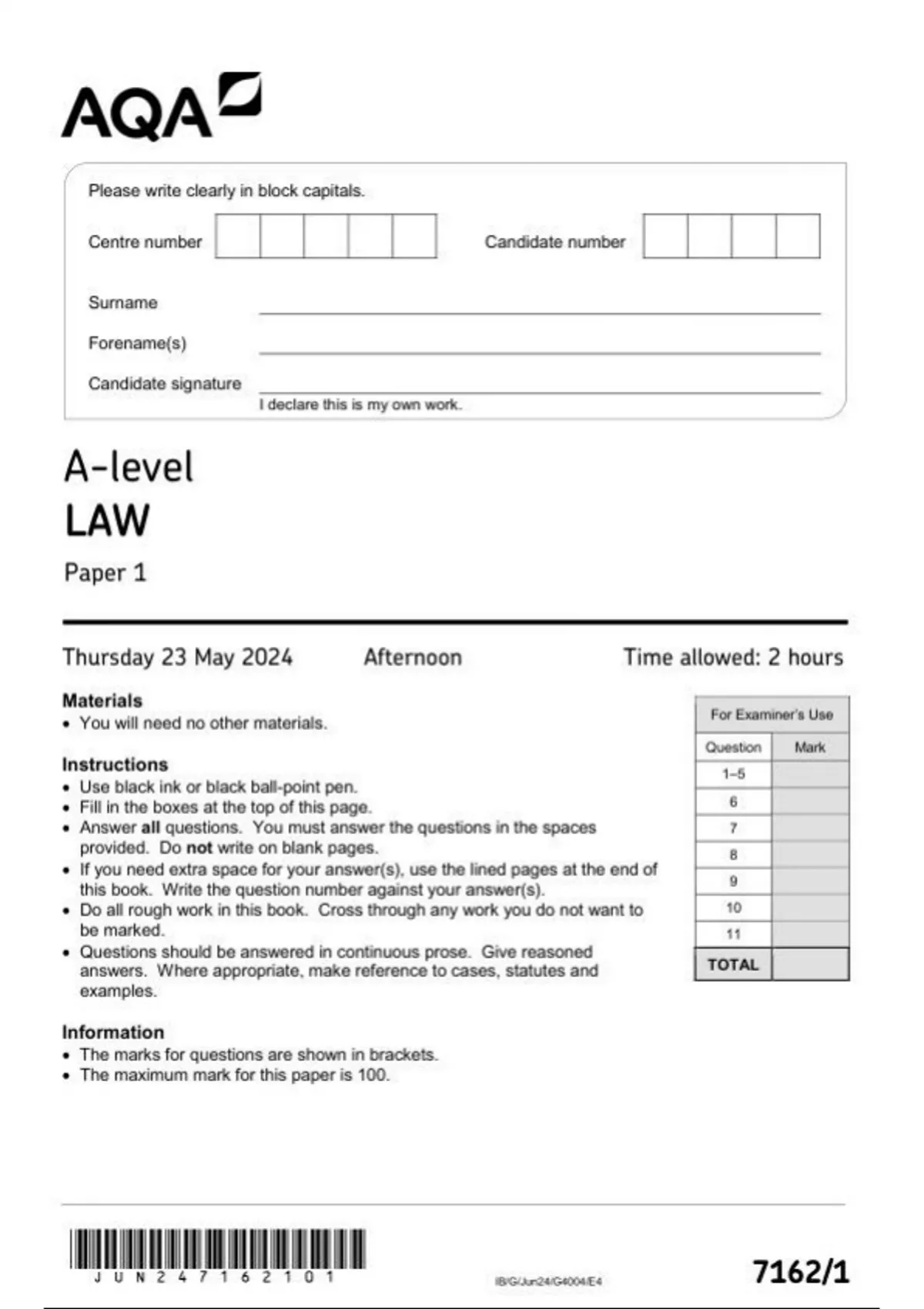 AQA A-level LAW Paper 1 7162-1 question paper june 2024