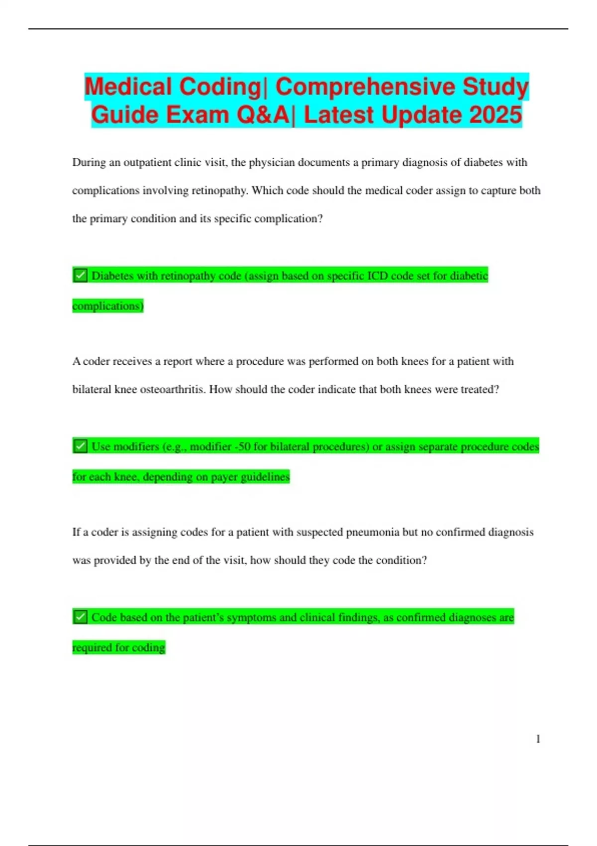 Medical Coding| Comprehensive Study Guide Exam Q&A| Latest Update 2025 During an outpatient clinic visit, the physician documents a primary diagnosis of diabetes with complications involving retinopathy. Which code should the medical coder assign to capture both the primary condition and its specific complication? Diabetes with retinopathy code (assign based on specific ICD code set for diabetic complications) A coder receives a report where a procedure was performed on both knees for a patient with bilateral knee osteoarthritis. How should the coder indicate that both knees were treated? Use modifiers (e.g., modifier -50 for bilateral procedures) or assign separate procedure codes for each knee, depending on payer guidelines If a coder is assigning codes for a patient with suspected pneumonia but no confirmed diagnosis was provided by the end of the visit, how should they code the condition? Code based on the patient’s symptoms and clinical findings, as confirmed diagnoses are required for coding 2 A patient undergoes a surgery where multiple procedures are performed in one operative session. How should a coder approach sequencing these codes? List the most complex or primary procedure first, followed by additional codes for secondary procedures, using any necessary modifiers The physician notes a complication due to a previously implanted medical device. What coding step should the coder take to reflect this complication? Use the appropriate ICD code for complications of the device, referencing specific code categories for implanted device issues How should a coder document a scenario where a patient had a new primary diagnosis identified during an inpatient stay? Assign a separate code for the new diagnosis and ensure proper sequencing based on the reason for admission and diagnosis priority In coding for telehealth services, what documentation is required to ensure proper coding and compliance? Document the type of service, the provider’s location, the patient’s location, and the method of communication (e.g., video or audio) 3 A patient with chronic kidney disease (CKD) stage 3 is admitted with acute kidney injury (AKI). How should these conditions be coded? Code both CKD and AKI, with AKI listed as the primary condition if it is the reason for the admission For an outpatient claim, the coder identifies that a procedure code is no longer valid for the current year. What is the coder's best action? Review the latest coding updates, find the current replacement code, and use it to avoid claim rejections How should a coder proceed when a payer denies a claim based on medical necessity? Review the documentation, confirm the accuracy of the diagnosis and procedure codes, and resubmit with any additional supportive documentation if needed