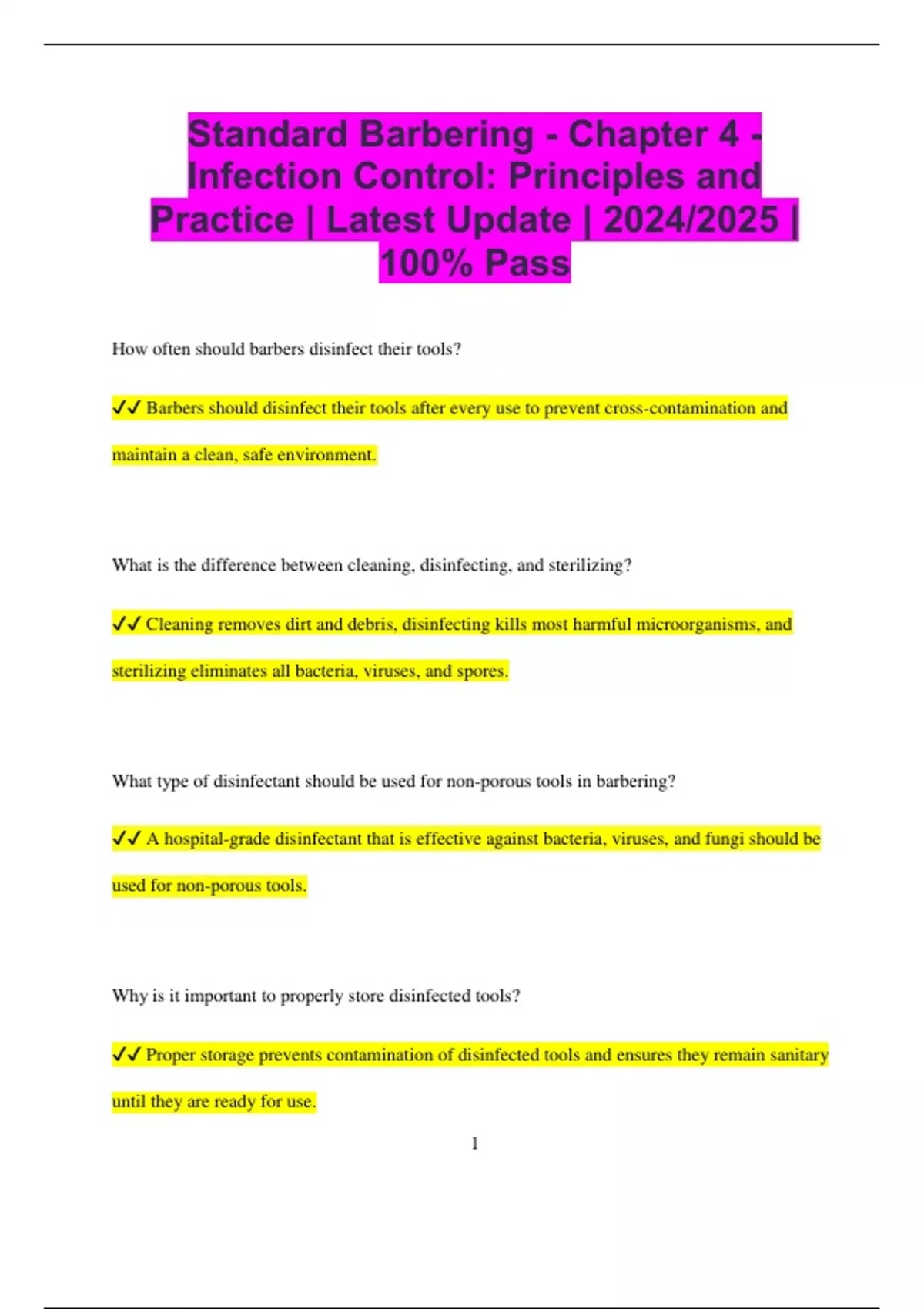 Standard Barbering - Chapter 4 - Infection Control: Principles and Practice | Latest Update | 2024/2025 | 100% Pass How often should barbers disinfect their tools? Barbers should disinfect their tools after every use to prevent cross-contamination and maintain a clean, safe environment. What is the difference between cleaning, disinfecting, and sterilizing? Cleaning removes dirt and debris, disinfecting kills most harmful microorganisms, and sterilizing eliminates all bacteria, viruses, and spores. What type of disinfectant should be used for non-porous tools in barbering? A hospital-grade disinfectant that is effective against bacteria, viruses, and fungi should be used for non-porous tools. Why is it important to properly store disinfected tools? Proper storage prevents contamination of disinfected tools and ensures they remain sanitary until they are ready for use. 2 What is the proper procedure for cleaning and disinfecting combs and brushes? Combs and brushes should be cleaned thoroughly to remove hair and debris, then disinfected with an appropriate solution according to manufacturer instructions. Why is it necessary for barbers to wear gloves during certain procedures? Gloves provide a barrier between the barber and potential contaminants, protecting both the client and the barber from infection. What should be done if a tool becomes contaminated during a service? If a tool becomes contaminated, it should be cleaned and disinfected immediately before reuse or disposed of if it cannot be disinfected. What is the recommended method for cleaning a razor after each use? A razor should be cleaned with hot water and soap, sanitized, and stored in a disinfected container to prevent contamination. How should a barber dispose of single-use items like razors and tissues? 3 Single-use items should be disposed of in a designated, covered waste container to prevent cross-contamination and maintain hygiene. What is the role of hand sanitizers in infection control for barbers? Hand sanitizers are used when soap and water are not available to quickly reduce the number of germs on the hands before handling clients or tools. Why should barbers avoid touching their face during services? Touching the face can transfer bacteria or viruses from the hands to the eyes, nose, or mouth, leading to potential infection. What should barbers do if they notice any cuts or open sores on their hands? Barbers should cover any cuts or open sores