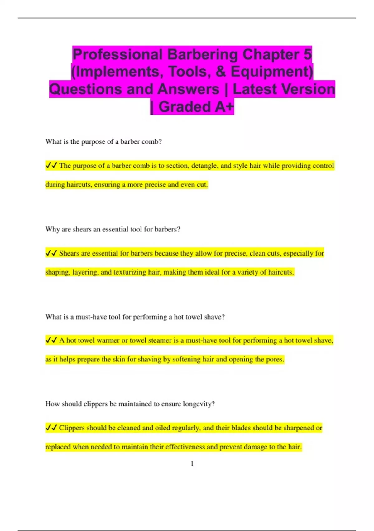Professional Barbering Chapter 5 (Implements, Tools, & Equipment) Questions and Answers | Latest Version | Graded A+ What is the purpose of a barber comb? The purpose of a barber comb is to section, detangle, and style hair while providing control during haircuts, ensuring a more precise and even cut. Why are shears an essential tool for barbers? Shears are essential for barbers because they allow for precise, clean cuts, especially for shaping, layering, and texturizing hair, making them ideal for a variety of haircuts. What is a must-have tool for performing a hot towel shave? A hot towel warmer or towel steamer is a must-have tool for performing a hot towel shave, as it helps prepare the skin for shaving by softening hair and opening the pores. How should clippers be maintained to ensure longevity? Clippers should be cleaned and oiled regularly, and their blades should be sharpened or replaced when needed to maintain their effectiveness and prevent damage to the hair. 2 What type of brush is commonly used to remove excess hair from a client after a haircut? A neck brush or dusting brush is commonly used to remove excess hair from a client after a haircut, ensuring the client remains clean and comfortable. What is the purpose of a razor in barbering? A razor is used in barbering for shaving and precision cutting, especially for outlining hairlines or creating clean edges and sharp lines. What is the difference between a straight razor and a safety razor? A straight razor has a long, exposed blade that requires more skill and care to use, while a safety razor has a protective guard around the blade, making it easier to handle and safer for beginners. Why should you avoid using dull scissors or shears in a barbershop? Dull scissors or shears should be avoided as they can cause uneven cuts, damage to the hair, and discomfort for the client, making the haircut less precise and professional. What is the purpose of a clipper guard? 3 A clipper guard is used to control the length of the hair being cut, allowing the barber to achieve a consistent and even trim while