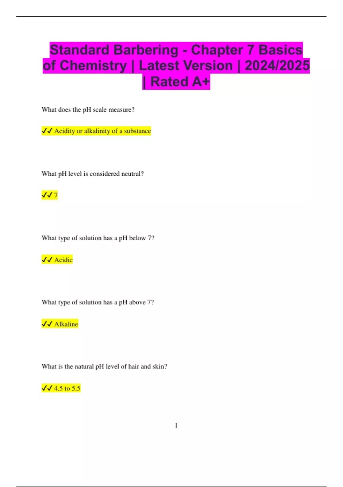 Standard Barbering - Chapter 7 Basics of Chemistry | Latest Version | 2024/2025 | Rated A+ What does the pH scale measure? Acidity or alkalinity of a substance What pH level is considered neutral? 7 What type of solution has a pH below 7? Acidic What type of solution has a pH above 7? Alkaline What is the natural pH level of hair and skin? 4.5 to 5.5 2 What happens when acids and alkalis are mixed together in equal parts? They neutralize each other. What is an example of an organic compound commonly found in hair products? Alcohol What type of chemical reaction releases heat? Exothermic reaction What type of chemical reaction absorbs heat? Endothermic reaction What is the main element found in hair? Keratin (a protein) What term describes the process of breaking down substances using water? Hydrolysis
