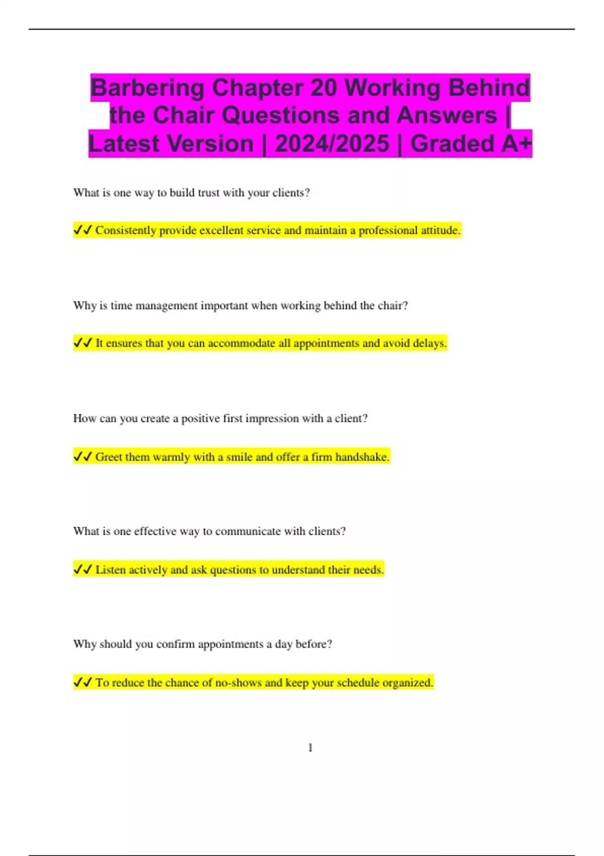 Barbering Chapter 20 Working Behind the Chair Questions and Answers | Latest Version | 2024/2025 | Graded A+ What is one way to build trust with your clients? Consistently provide excellent service and maintain a professional attitude. Why is time management important when working behind the chair? It ensures that you can accommodate all appointments and avoid delays. How can you create a positive first impression with a client? Greet them warmly with a smile and offer a firm handshake. What is one effective way to communicate with clients? Listen actively and ask questions to understand their needs. Why should you confirm appointments a day before? To reduce the chance of no-shows and keep your schedule organized. 2 What should you do if you’re running behind schedule? Inform the client and offer an estimated waiting time. Why is it important to keep your work area clean? It promotes a hygienic environment and gives a professional impression. How can you manage stress during a busy day? Take deep breaths and stay focused on one task at a time. What’s a good way to handle a dissatisfied client? Listen to their concerns, apologize sincerely, and offer to make it right. Why is it important to stay updated on the latest trends? To offer clients modern styles and keep your skills competitive. What is one way to protect your health while working behind the chair? Practice good posture to avoid back and neck strain. 3 How can you build a loyal clientele? Provide consistent, high-quality service and show appreciation for their business. What should you do before starting a service with a new client? Conduct a thorough consultation to understand their expectations. Why is personal grooming important in the barbering industry? It reflects professionalism and sets a positive