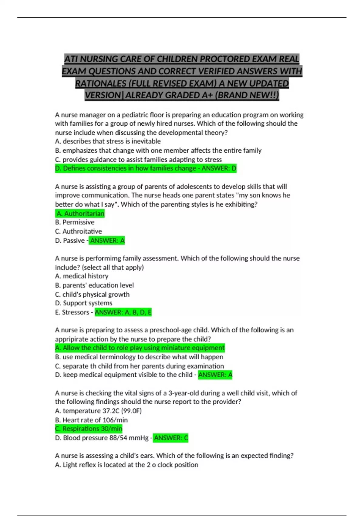 ATI NURSING CARE OF CHILDREN PROCTORED EXAM REAL EXAM QUESTIONS AND CORRECT VERIFIED ANSWERS WITH RATIONALES (FULL REVISED EXAM) A NEW UPDATED VERSION|ALREADY GRADED A+ (BRAND NEW!!)