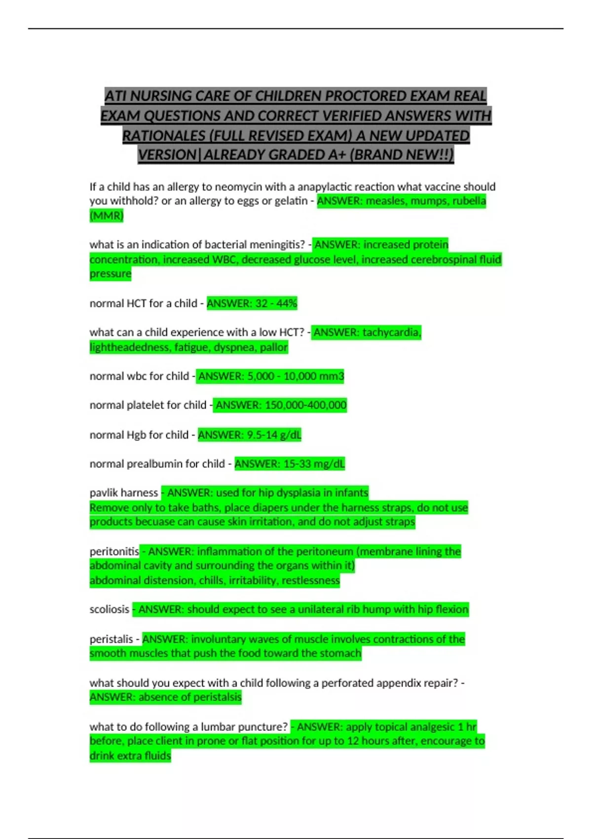 ATI NURSING CARE OF CHILDREN PROCTORED EXAM REAL