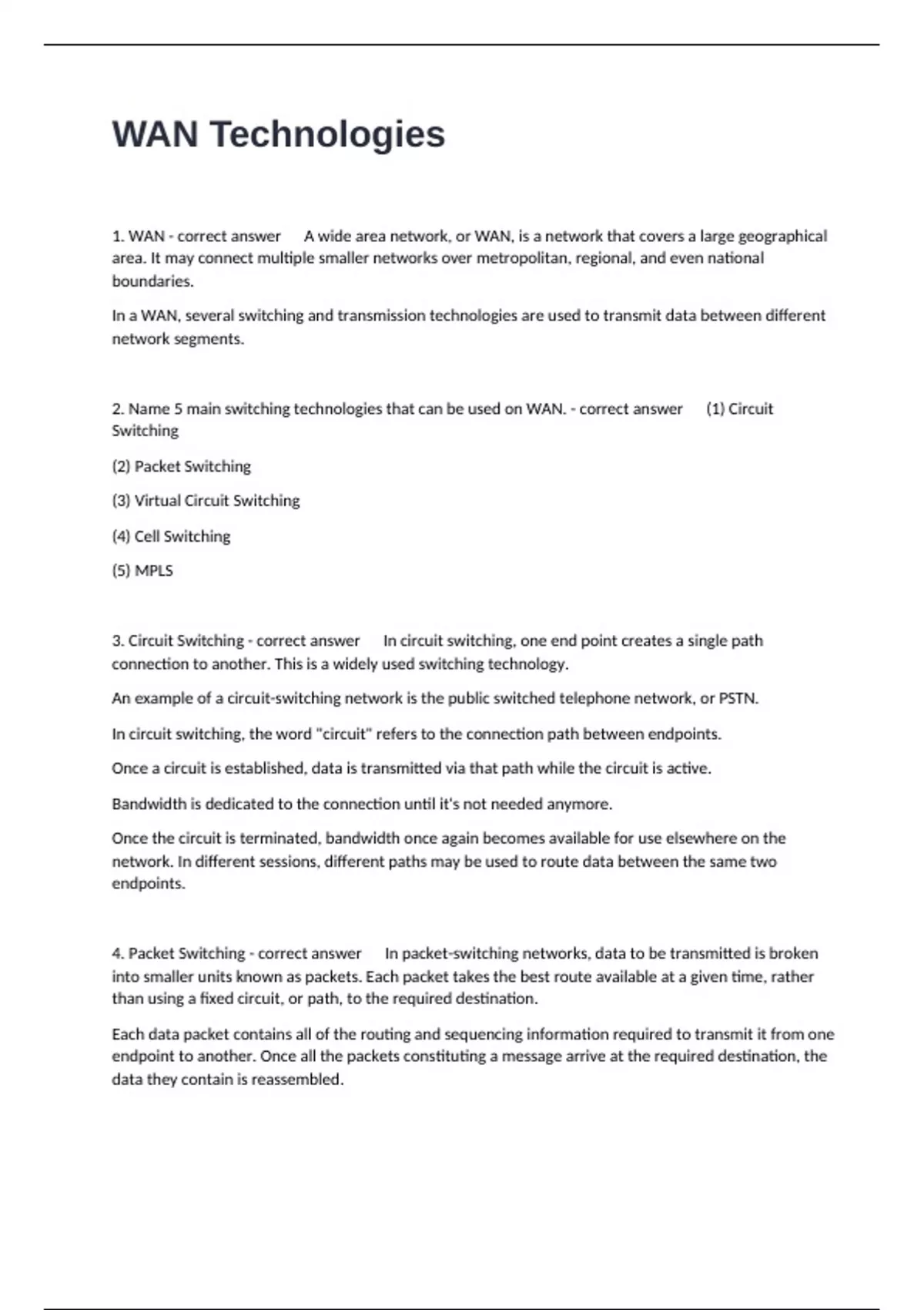 1. WAN - correct answer A wide area network, or WAN, is a network that covers a large geographical area. It may connect multiple smaller networks over metropolitan, regional, and even national boundaries. In a WAN, several switching and transmission technologies are used to transmit data between different network segments. 2. Name 5 main switching technologies that can be used on WAN. - correct answer (1) Circuit Switching (2) Packet Switching (3) Virtual Circuit Switching (4) Cell Switching (5) MPLS 3. Circuit Switching - correct answer In circuit switching, one end point creates a single path connection to another. This is a widely used switching technology. An example of a circuit-switching network is the public switched telephone network, or PSTN. In circuit switching, the word "circuit" refers to the connection path between endpoints. Once a circuit is established, data is transmitted via that path while the circuit is active. Bandwidth is dedicated to the connection until it's not needed anymore. Once the circuit is terminated, bandwidth once again becomes available for use elsewhere on the network. In different sessions, different paths may be used to route data between the same two endpoints. 4. Packet Switching - correct answer In packet-switching networks, data to be transmitted is broken into smaller units known as packets. Each packet takes the best route available at a given time, rather than using a fixed circuit, or path, to the required destination. Each data packet contains all of the routing and sequencing information required to transmit it from one endpoint to another. Once all the packets constituting a message arrive at the required destination, the data they contain is reassembled. Packet switching allows for frequent changes in a network, adjusting the paths that data takes as required to compensate for network congestion or broken links. Frame Relay is an example of a packet-switching standard. It is effective for the on demand nature of traffic which is typical of many networked applications. 5. Virtual Circuit Switching - correct answer Virtual circuit switching has characteristics of both packet and circuit switching. It transfers packets via logical circuits, which don't have physical resources such as frequencies or time slots allocated to them. Frame relay is a packet switching technology which uses virtual circuits. Logical paths are assigned to identities rather than physical locations, and can be either permanent or switched. Each of the packets carries a Virtual Circuit Identifier, or VCI, that is local to a link and updated by each switch on the path, from the source to the destination of the packet. 6. There are 2 types of virtual circuits, what are they? - correct answer • Permanent virtual circuits - or PVCs - which are always on, and • Switched virtual circuits - or SVCs - which make single connections as needed 7. PVC - correct answer A PVC usually takes the form of a leased line, which a customer pays a fixed monthly fee to use. The line is manually built and maintained by a telephone company. A PVC provides a fast, reliable connection that remains fixed - so there's no need for customers to re-establish a connection each time they require one. 8. SVC - correct answer SVCs are set up on a per-call basis. They provide more flexibility than PVCs, enabling a single connection to one endpoint to be connected to multiple other endpoints, as needed. When a network device attempts to connect to a WAN, an SVC is requested and the carrier establishes the connection. Like in the case of long-distance phone calls, customers typically pay for using a connection based on their connection time. This can be less expensive than paying a fixed monthly fee to use a PVC. 9. Cell Switching - correct answer Cell-switching networks are similar to packet-switching networks except that data is transmitted as fixed-length cells instead of as variable-length packets. If there isn't enough data to fill up an entire cell, the rest of the space in the cell is filled with blank - or filler - data. An example of a cell-switching protocol is Asynchronous Transfer Mode, or ATM. The advantage of cell switching over packet switching is its predictability. Cell switching makes it easy to track how much data is moving on a network. 10. MPLS - correct answer MPLS is a high-performance, multi-service, switching technology. It's defined by a set of Internet Engineering Task Force, or IETF, specifications that enable network devices such as routers to establish and manage network traffic. MPLS ensures faster switching of data than normal packet switching because it uses label switching, which can look at Layer 2 attributes to make path determination more efficient. In an MPLS network, a router adds a label to each incoming data packet. Other routers then forward the packet along a predefined path, based on the label rather than on its destination IP address. This reduces the number of routing lookups that routers have to perform. 11. Why is MPLS known as "Multiprotocol"? - correct answer MPLS can transport data using different technologies and protocols such as IP, ATM, Frame Relay, Synchronous Optical Network - or SONET - and Ethernet over a common infrastructure. This is why it's known as "multiprotocol." 12. Explain how MPLS handles network traffic - correct answer MPLS enables class of service, or CoS, tagging and prioritization of network traffic, so network administrators can specify which traffic should take priority on a network, based on which applications are the most important. This makes MPLS especially useful for supporting real-time streaming media applications that are sensitive to transmission delays. For example, it enables administrators to ensure that Voice over IP, or VoIP, traffic is prioritized on a network. MPLS carriers differ in the number of classes of service they offer and the pricing of these CoS tiers. 13. ATM - correct answer ATM is a cell-switching ne