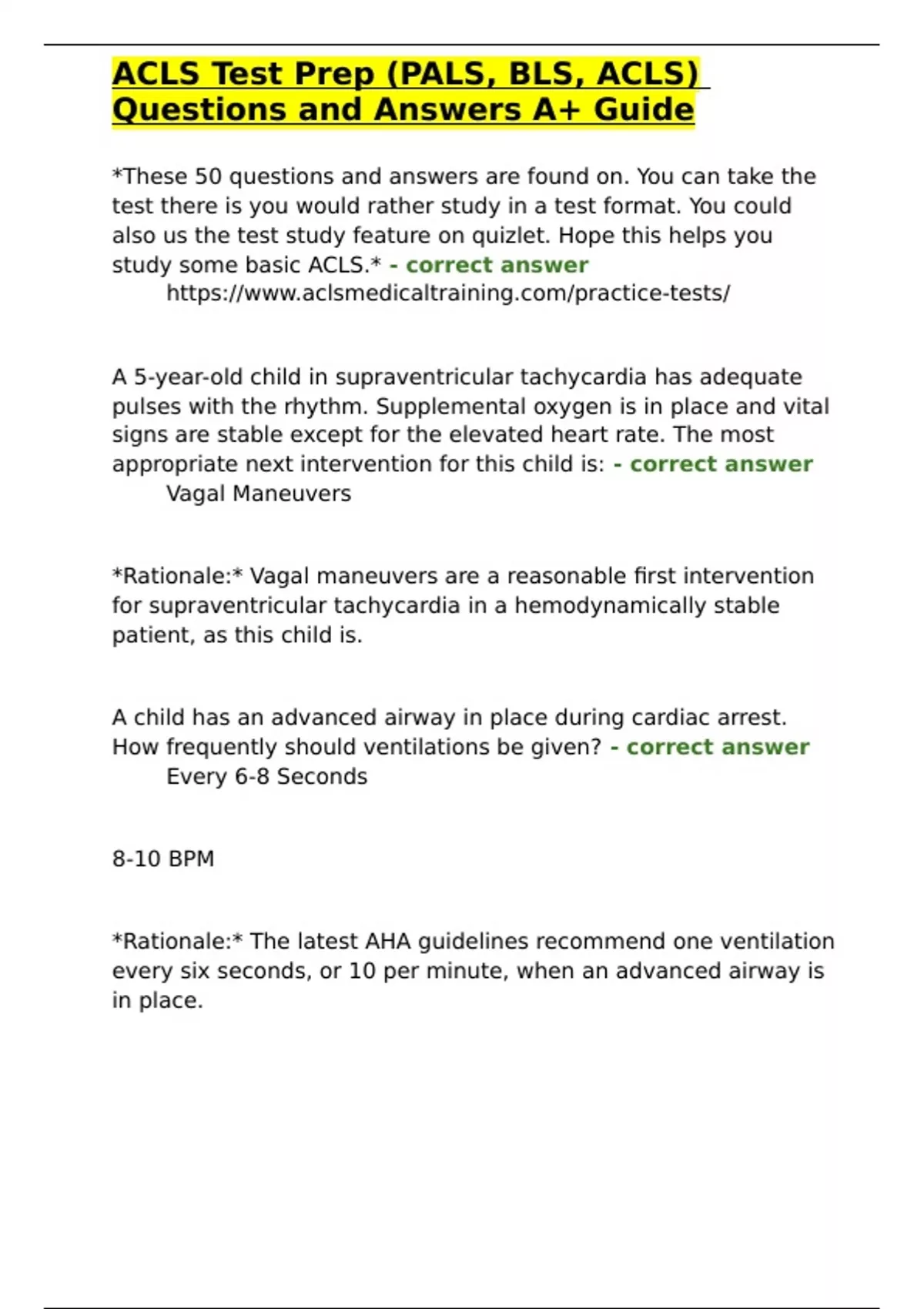 ACLS Test Prep (PALS, BLS, ACLS) Questions and Answers A+ Guide
