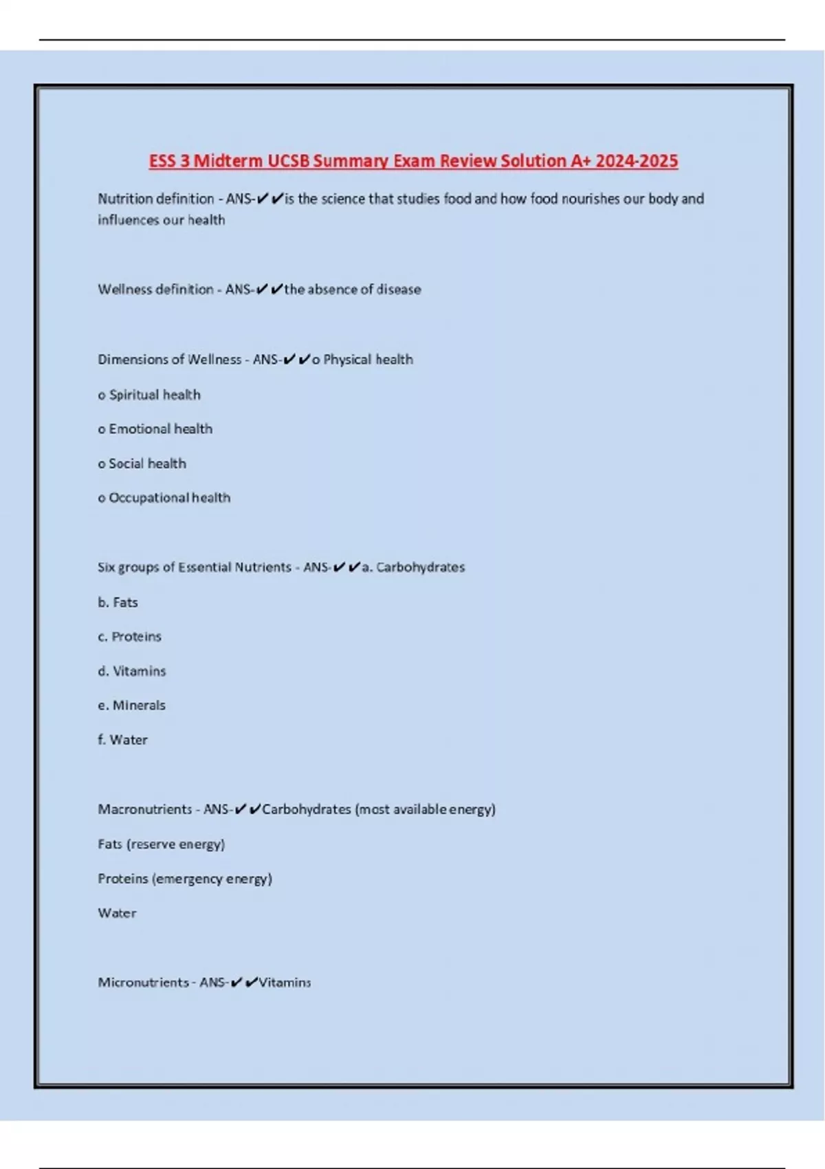 ESS 3 Midterm UCSB Summary Exam Review Solution A+ Nutrition definition - ANS-is the science that studies food and how food nourishes our body and influences our health Wellness definition - ANS-the absence of disease Dimensions of Wellness - ANS-o Physical health o Spiritual health o Emotional health o Social health o Occupational health Six groups of Essential Nutrients - ANS-a. Carbohydrates b. Fats c. Proteins d. Vitamins e. Minerals f. Water Macronutrients - ANS-Carbohydrates (most available energy) Fats (reserve energy) Proteins (emergency energy) Water Micronutrients - ANS-...