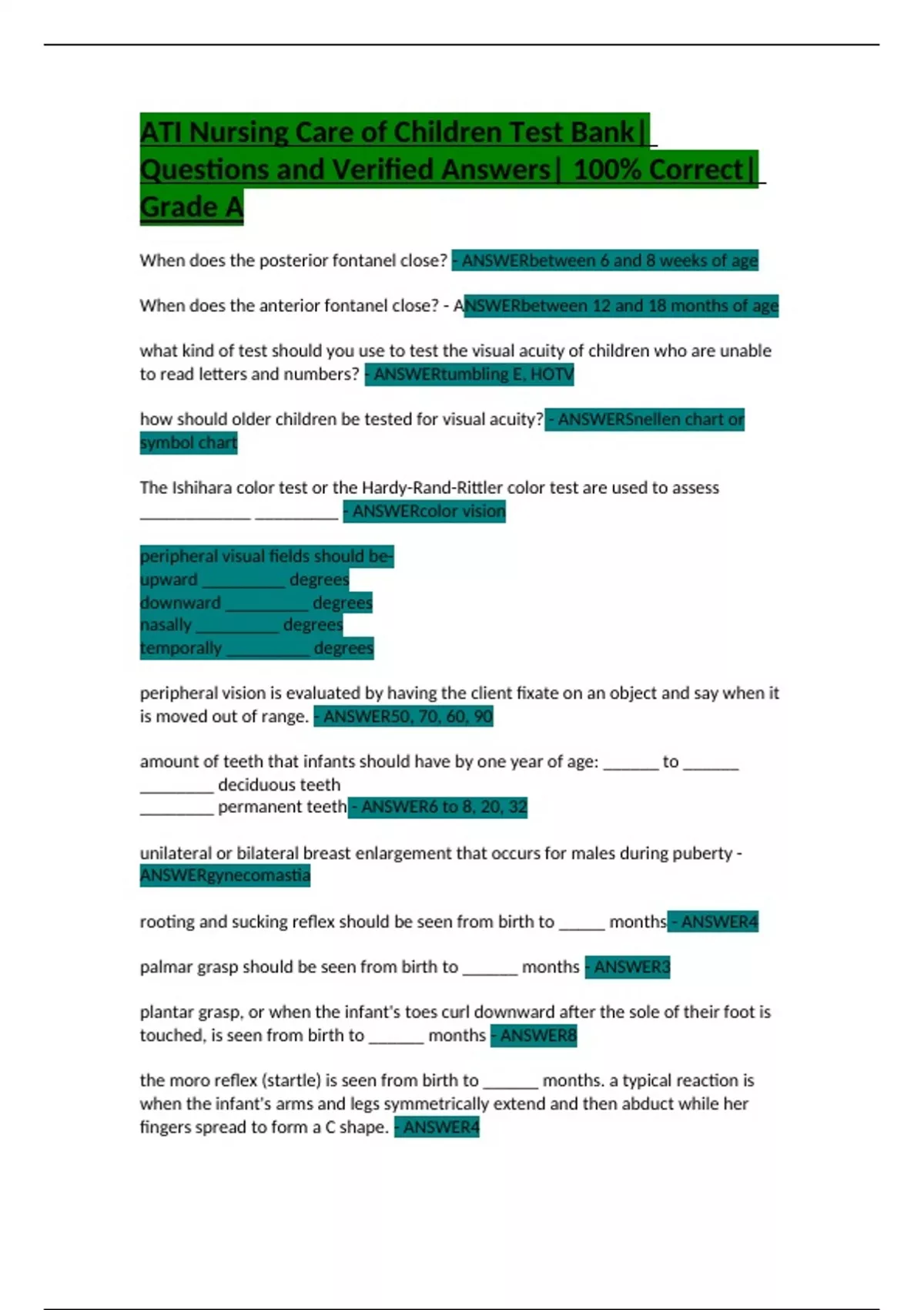 ATI Nursing Care of Children Test Bank| Questions and Verified Answers| 100% Correct| Grade A