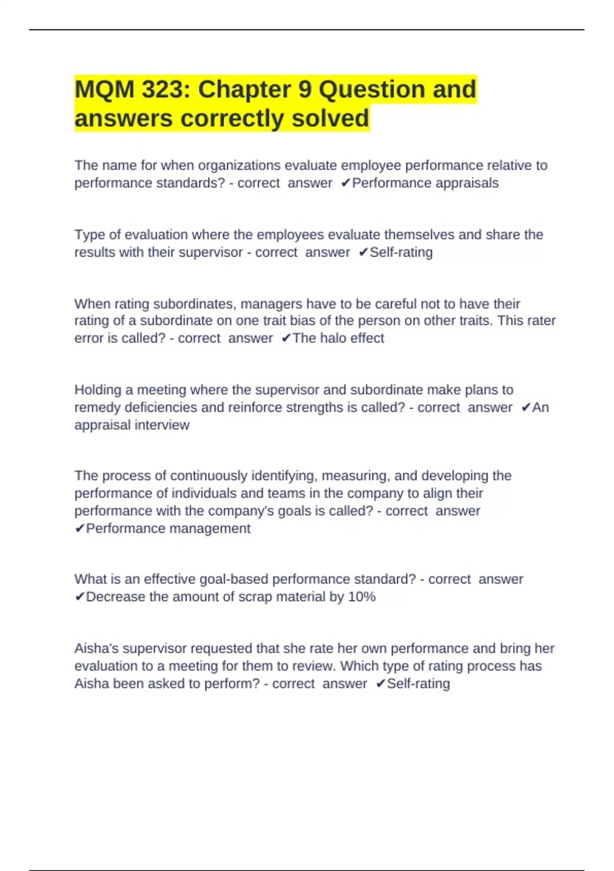 MQM 323: Chapter 9 Question and answers correctly solved The name for when organizations evaluate employee performance relative to performance standards? - correct answer Performance appraisals Type of evaluation where the employees evaluate themselves and share the results with their supervisor - correct answer Self-rating When rating subordinates, managers have to be careful not to have their rating of a subordinate on one trait bias of the person on other traits. This rater error is called? - correct answer The halo effect Holding a meeting where the supervisor and subordinate make plans to remedy deficiencies and reinforce strengths is called? - correct answer An appraisal interview The process of continuously identifying, measuring, and developing the performance of individuals and teams in the company to align their performance with the company's goals is called? - correct answer Performance management