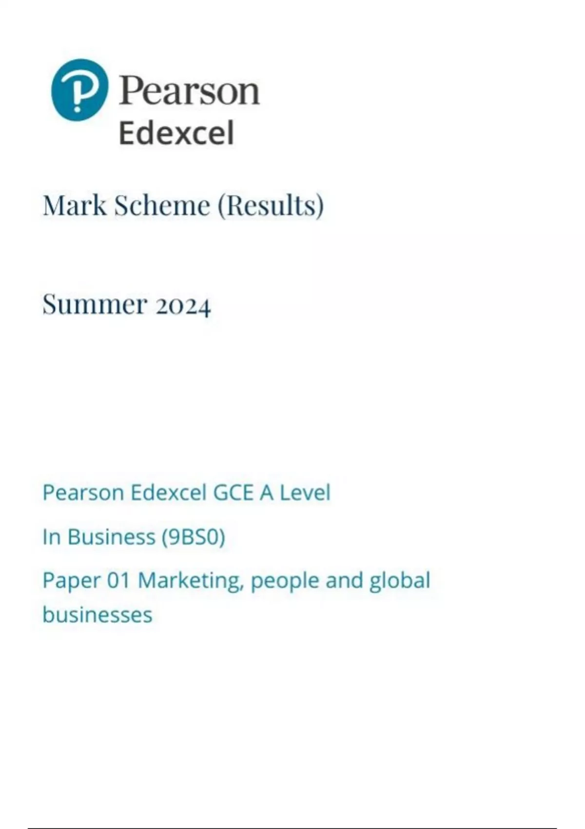 Pearson Edexcel GCE A Level In Business (9BS0) Paper 01 Marketing, people and global businesses mark scheme june 2024 9bs0-01